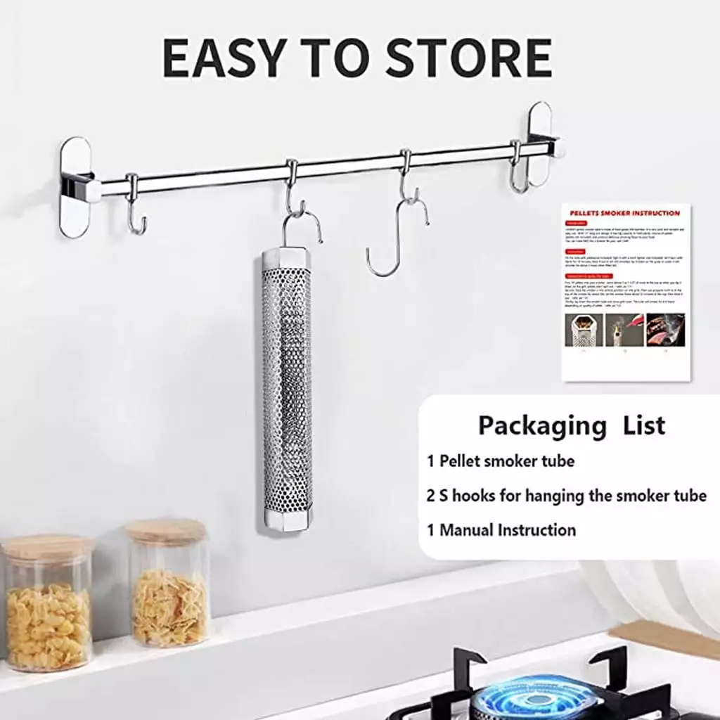The pellet smoker tube has massive density diffusion holes on its body. So the smoker tube can let come in. diffusing efficiently and evenly to your eatables thing. The perforated design and hexagon shape of tube smoker allow the pellets stay lit the and fully burn to provide constant . This tube can be used with various wood pellets such as . hickory. mesquite. . pecan to add different tastes. It can also be used with wood chips. You can mix these or stack them in the tube.