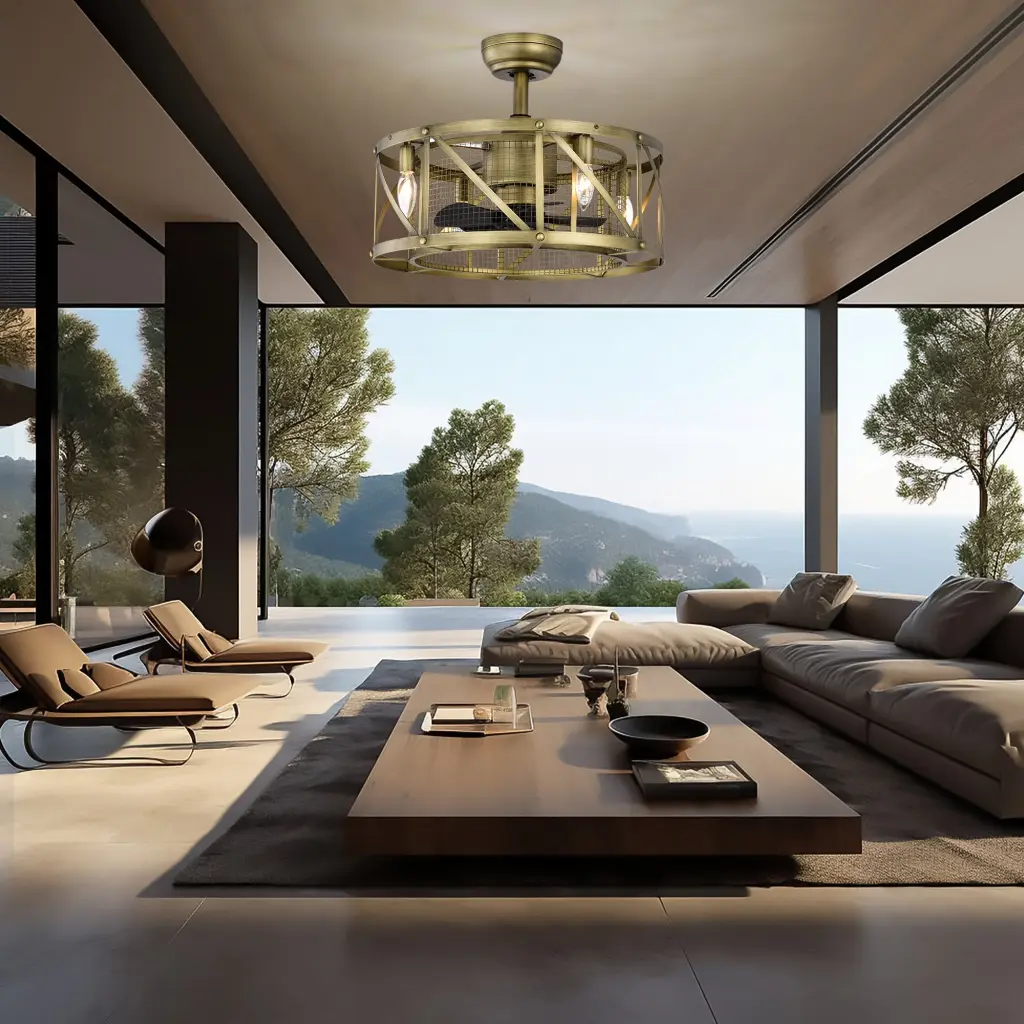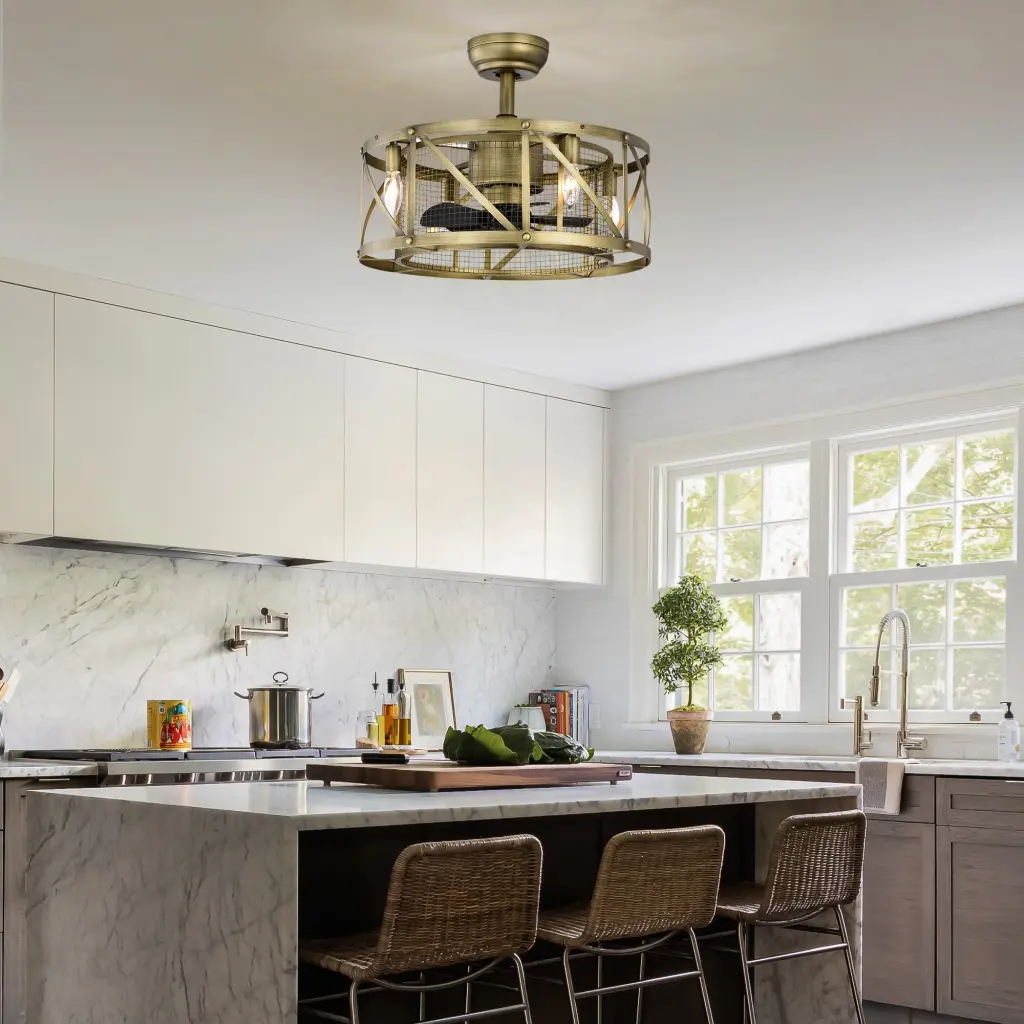 Small ceiling fan with lights: Design of 20″ caged ceiling fan with 5 small blades take up less space. Refinely for small to medium space with low profile ceiling.