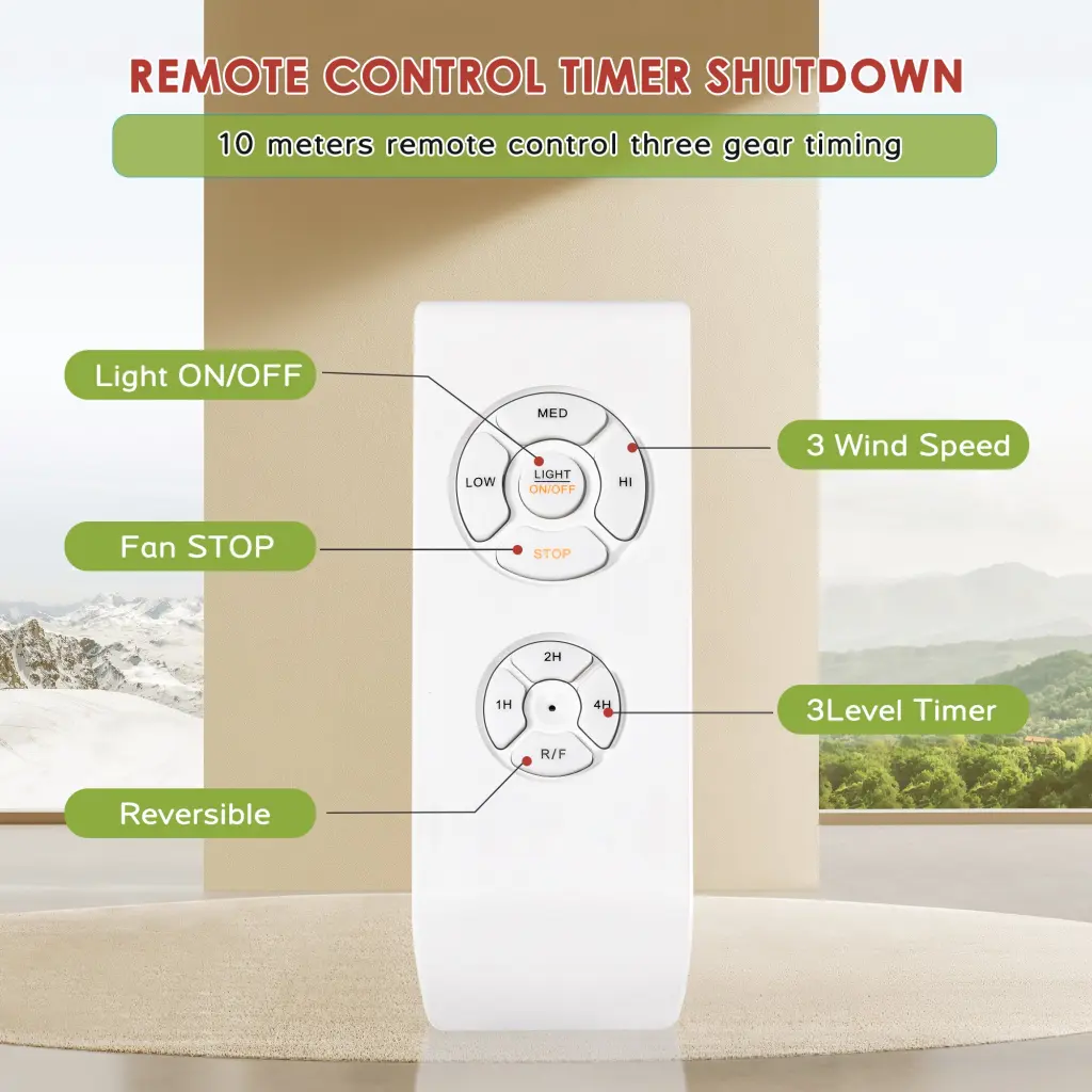 Remote control included: Enclosed ceiling fan provides 3 adjustable wind speed (Hi/Med/Low). Timer and reversal function set by remote easily. Make simple to maintain the ideal comfort level whether you are sitting or lying down.