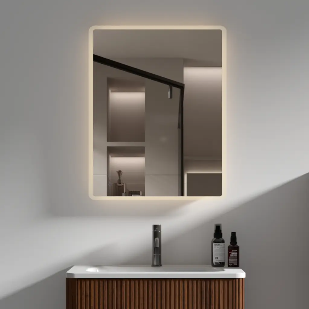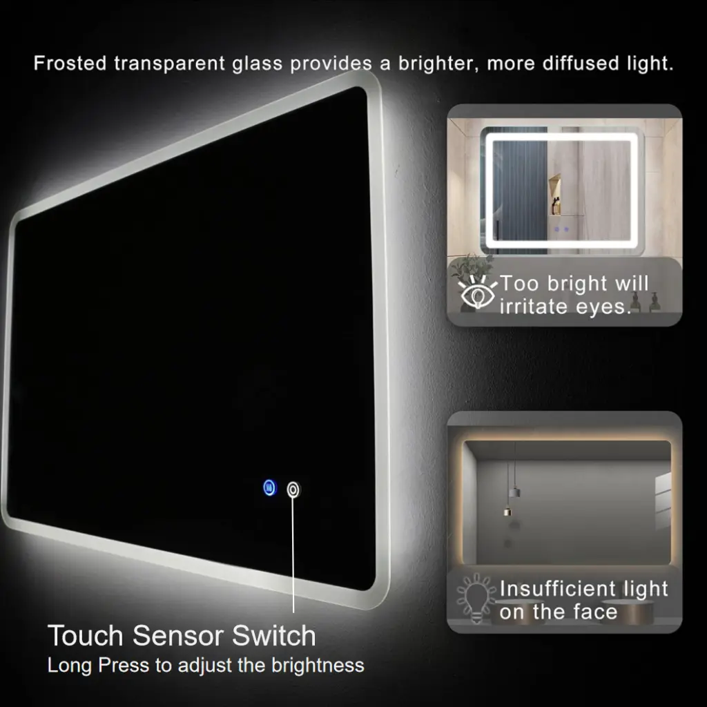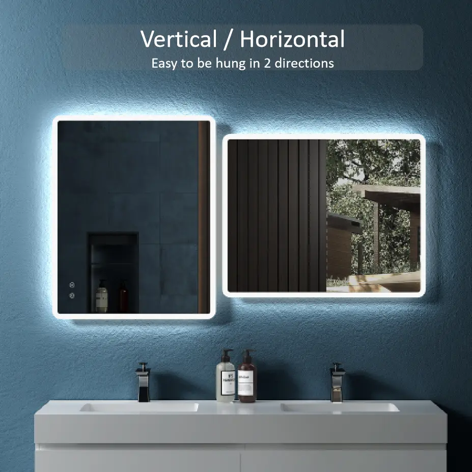24″ W x30 ” H Modern Wall Mounted Led Backlit Anti-Fog Rounded Rectangular Bathroom Mirror with Us standard plug, Temperature Customizable and Memory Function Touch Switch Description: [Ethereal luminous effect], [Smart dual control], [Intelligent defogging function] Encounter the epitome of modern elegance with o
