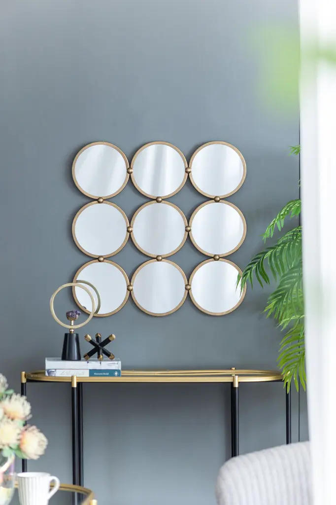 27.2″ in Contemporary Decorative Mirror with Mininalist Style for Bedroom,Liveroom & Entryway Specification: The Design Art piece or wall mirror? Let the conversations flow around this intriguing Harmony 9 Ring Metallic Wall Mirror. At 27″,the square frame creates the perfect shape for these repetitive patterns fo