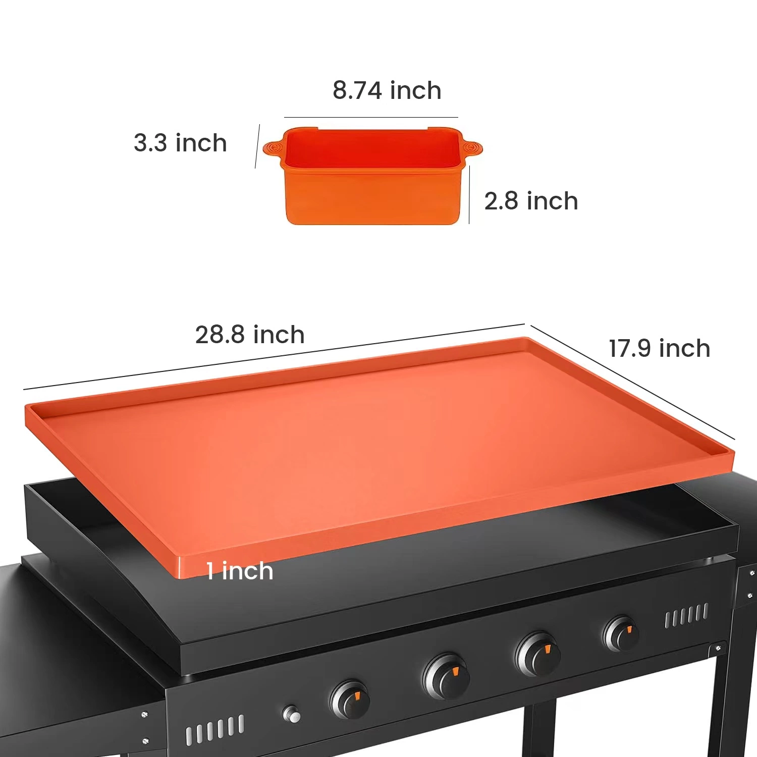 - [Package Content]You will receive 1 piece griddle mat silicone protective cover and 1 piece grease cup liner. Silicone grill mat size: 73.2×45.5×2.5cm/ 28.8×17.9×1 inch (LxWxH). Grill Mat Weight: 872g/ 1.92 lbs. Silicone grease drip pan size: 22.2×8.4×7.1cm/ 8.74×3.3×2.8inch(LxWxH). weight: 110g/ 3.88 ounces. Please confirm your griddle size before purchasing.