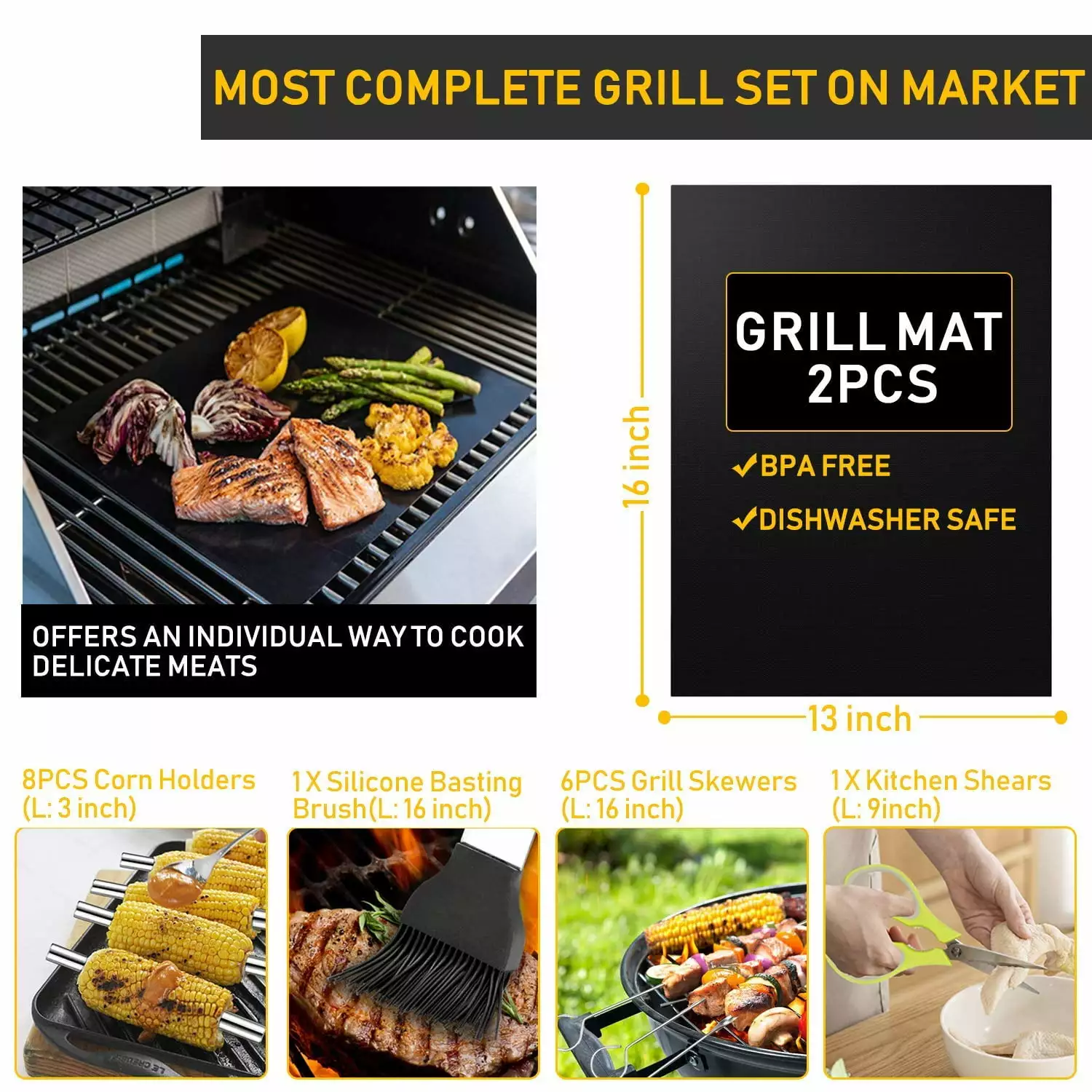 - Most Complete Set: This 34Pcs bbq set is the most complete grill accessories set on the market that includes everything you need. It includes long-handled grill tongs. spatula. fork. tongs with wide side and hollow design. meat knife. 2 basting brushes. 2 grill cleaning brushes. meat injector. meat thermometer. pepper & salt shakers. 8 corn holders. 6 skewers. grill glove. carry bag. small knife and fork. 2 grill mats. kitchen shears.