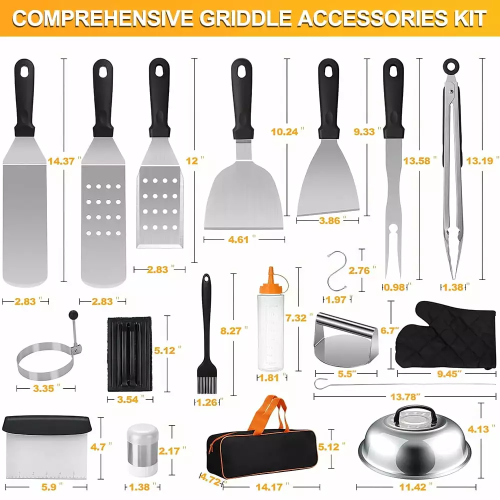 - [Comprehensive Griddle Accessories Kit]- 17Pcs Premium grill accessories could meet all your needs coming with 2* Oversized Spatulas. 1* Barbecue Spatula with 3 beveled edges. 1* Slant Edge Scraper 1* Graduated Chopping Scraper. 2* Sauce Bottles. 1* Slant Edge Scraper. 1* Sauce Brush 1* Grill Locking Tongs. 4* Egg Rings (3.5). 1* Basting Cover. 1* Cleaning Brush. 1* Carrying Bag.