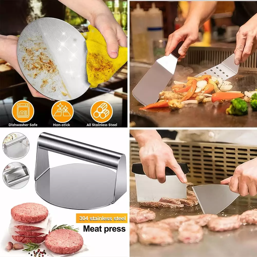 2.[PREMIUM MATERIAL] Our flat top grill accessories are well made by heavy gauge stainless steel. Rust-proof and anti-corrosion. Sturdy structure design can hold more foods. The plastic handle is heat resistant and comfortable to hold. so you don’t have to worry about heat waves while grilling. The Burger Press is made with stainless steel is solidly installed. Easy to clean and dishwasher safe.