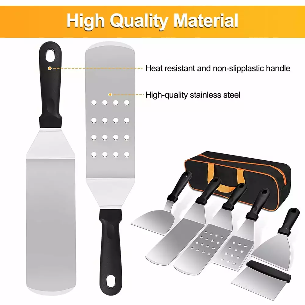- [Reasonable Ergonomic Design]- Heat-resistant ABS handle will prevent scalding your hands when you working at high temperature. offering a comfortable grip. Ergonomic design of 45 structure helps to flip food easily. beveled edge to slide under food easily. Long handle griddle spatula for handling large sized grills. offers your hand a safe distance away from the heat. Grill tools kit is suitable for any blackstone griddle or flat top. hibachi. teppanyaki.