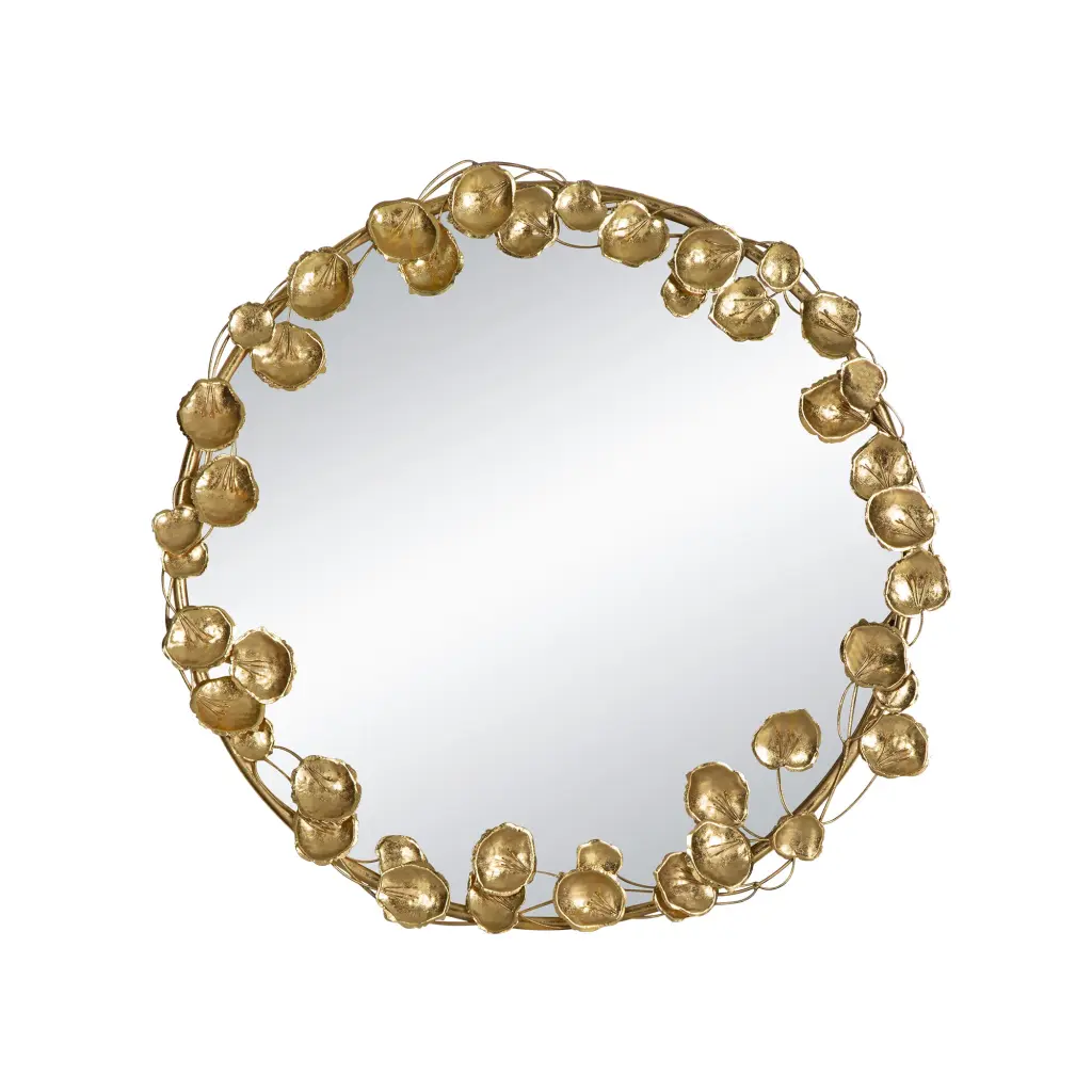 35″ Round Metallic Wall Mirror with Precious metalen Leaf Accents, Modern Decor Mirror for Living Room Entryway Hallway Specification: The Design Revitalizing the traditional round accent mirror, this piece proudly boasts a ring of whimsical gold leaves to create a striking modern focal point for any room in your home. Crafted