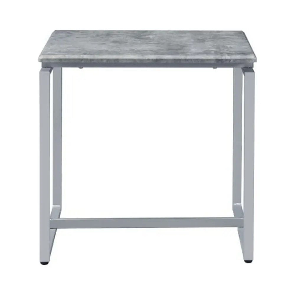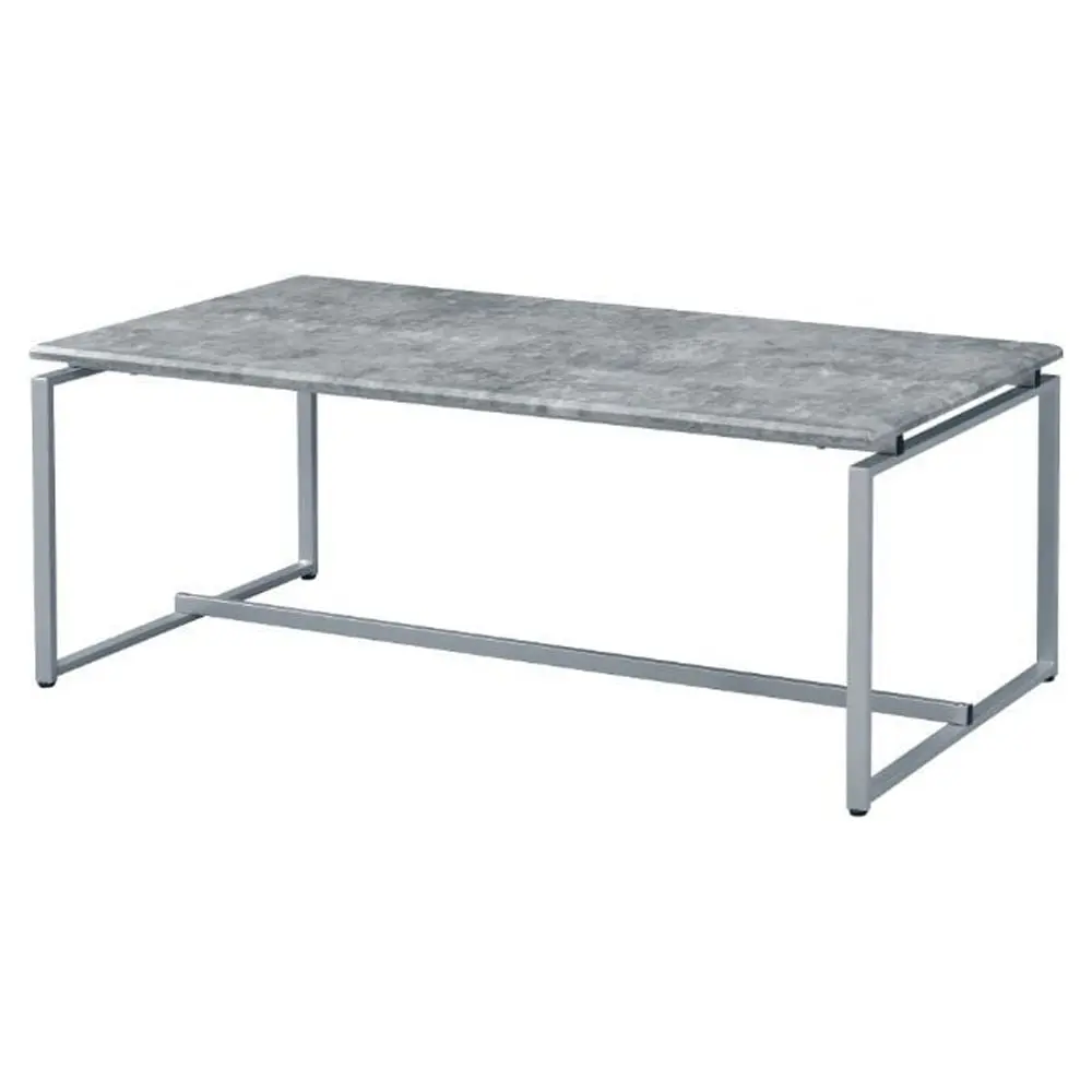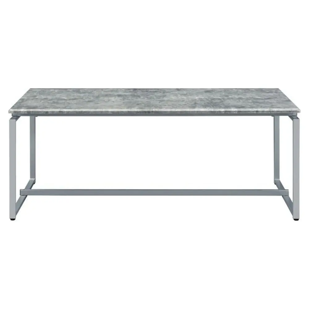 Stylish and super sturdy. the 47" silver and faux concrete pvc veneer rectangular coffee table is an amazingly good looking coffee table that will compliment your living room. The silver coloration of the high quality metal base marries nicely with the faux concrete pvc veneer top surface. This rectangular table is an classic yet updated way to accent your room. It has a fresh design that will definitely breathe some fresh air into your interior. This coffee table is the sturdy. reliable and stylish answer to your living room needs. 18" H x 47" W x 22" D47" Silver And Faux Concrete Pvc Veneer Rectangular Coffee Table