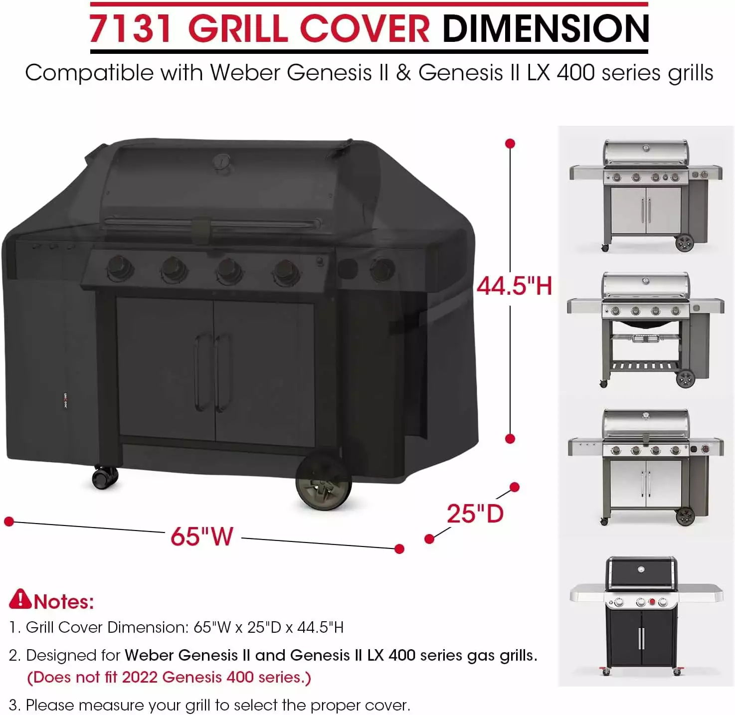 - [Grill Cover 65 Inch Dimension]Measures 65W x 25D x 44.5H. Same dimension with Weber 7131 grill cover. compatible with Weber any 4 burner grills. Genesis II and Genesis II LX 400 series(Does not fit 2022 Genesis 400 series). Also works for other 3 – 5 burners grills with similar sizes up to 63W. such as Char-Broil. Nexgrill. Napoleon. Broil King and more.