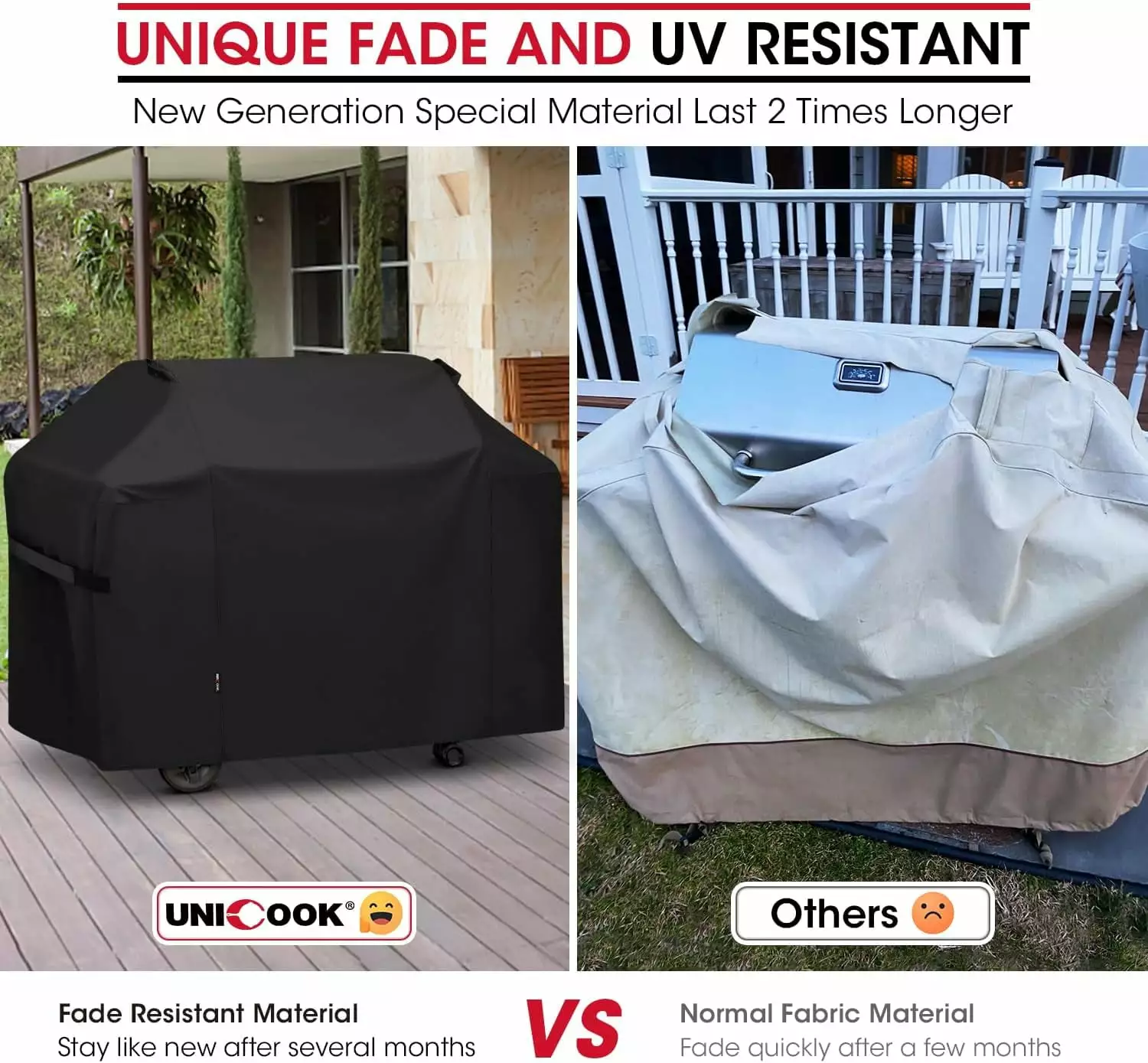 - [Premium Material Construction]Unicook bbq grill covers built to thicker. heavier and last longer. Constructed with Heavy Duty Fade Resistant polyester fabric with Waterproof vinyl coating. cost twice as the normal market materials do. protect your grill from all elements.