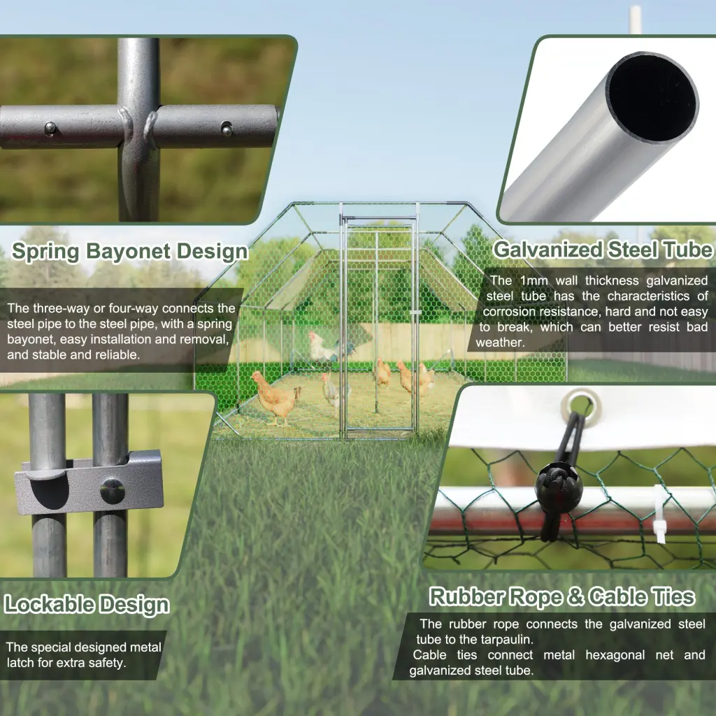 Featuring galvanized coop, robust steel tubes with eco-friendly power coating concludeing, guaranteed to last for years. The coating is protective and resists rust, corrosion, and fading so that the coop is weatherproof and of great durability.
