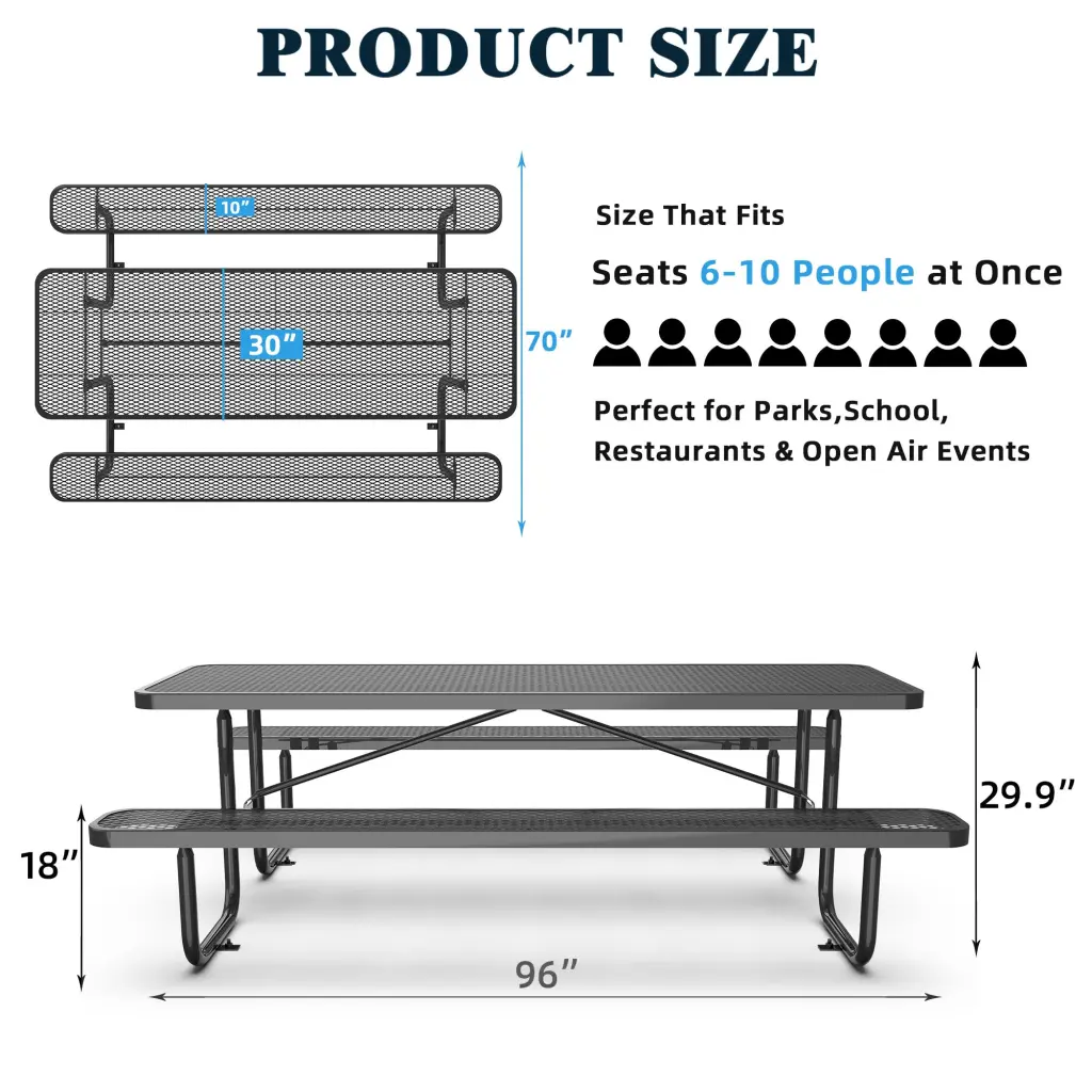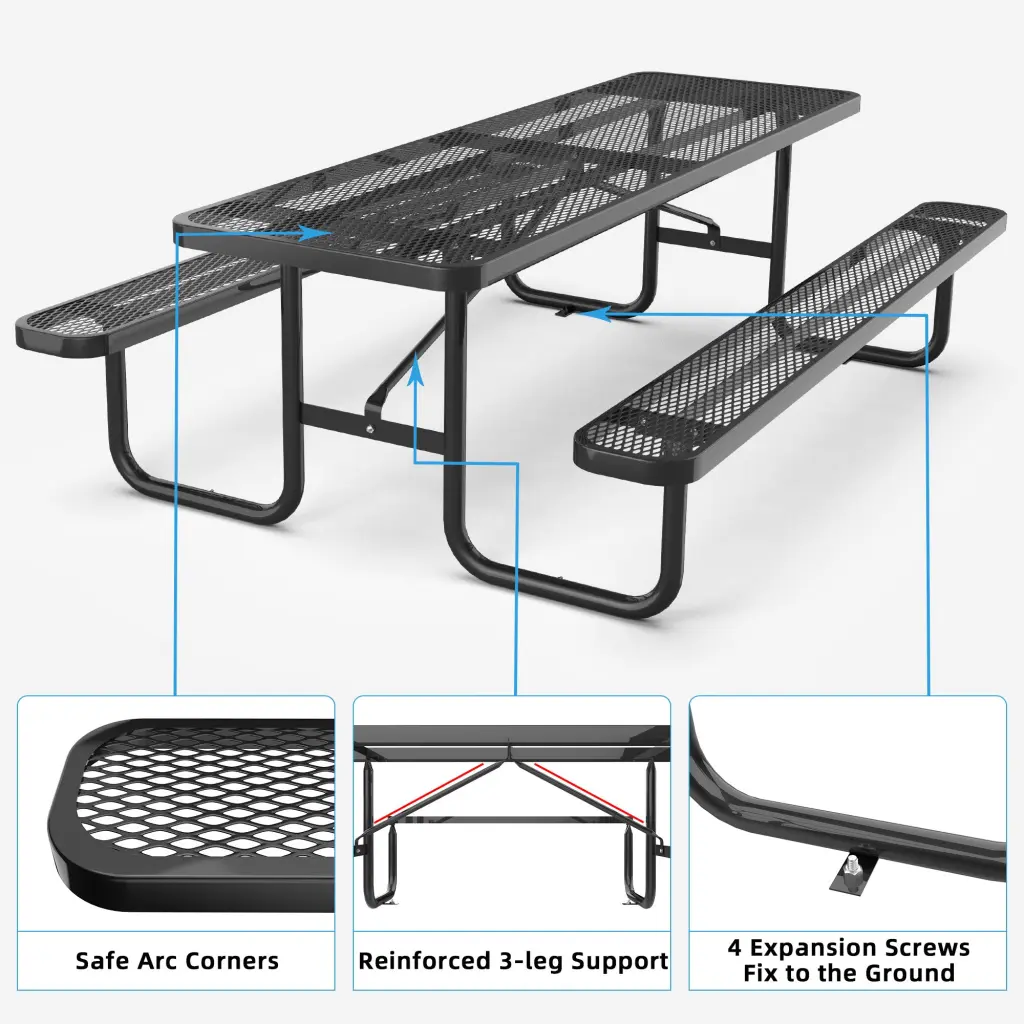 96″ Expanded Metallic Rectangular Picnic Table, Black Specification: Anchors Mounting screw anchor the table to the ground for added stability Smooth & Rounded Edges Help to avoid kids’ accidental injuries such as bumps and scratches Thick Tubes & Galvanized Power Coated Frame Protects from environmental facto