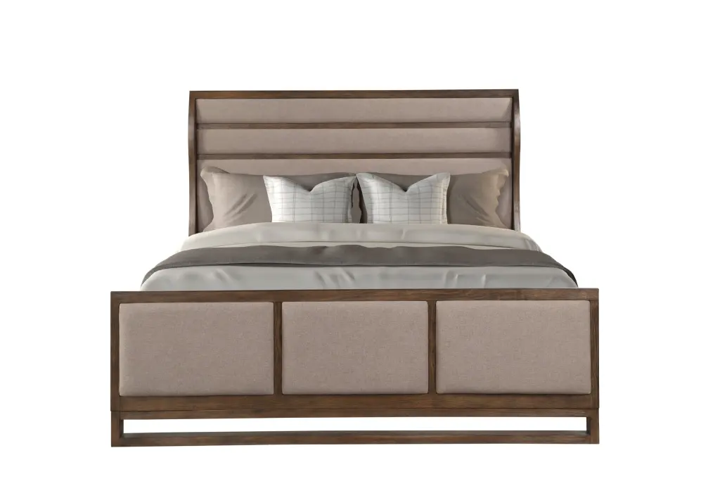 Arcadia Queen Dimensions Bed, Old Forest Glen Finish Description: Bring home the Arcadia Queen Dimensions Bed from for a rustic modern upgrade in your bedroom. The frame is expertly crafted from Pine solids and Oak Veneers and features Old Forest Glen conclude, 100% polyester upholstered panel inlays on both headboard and foot