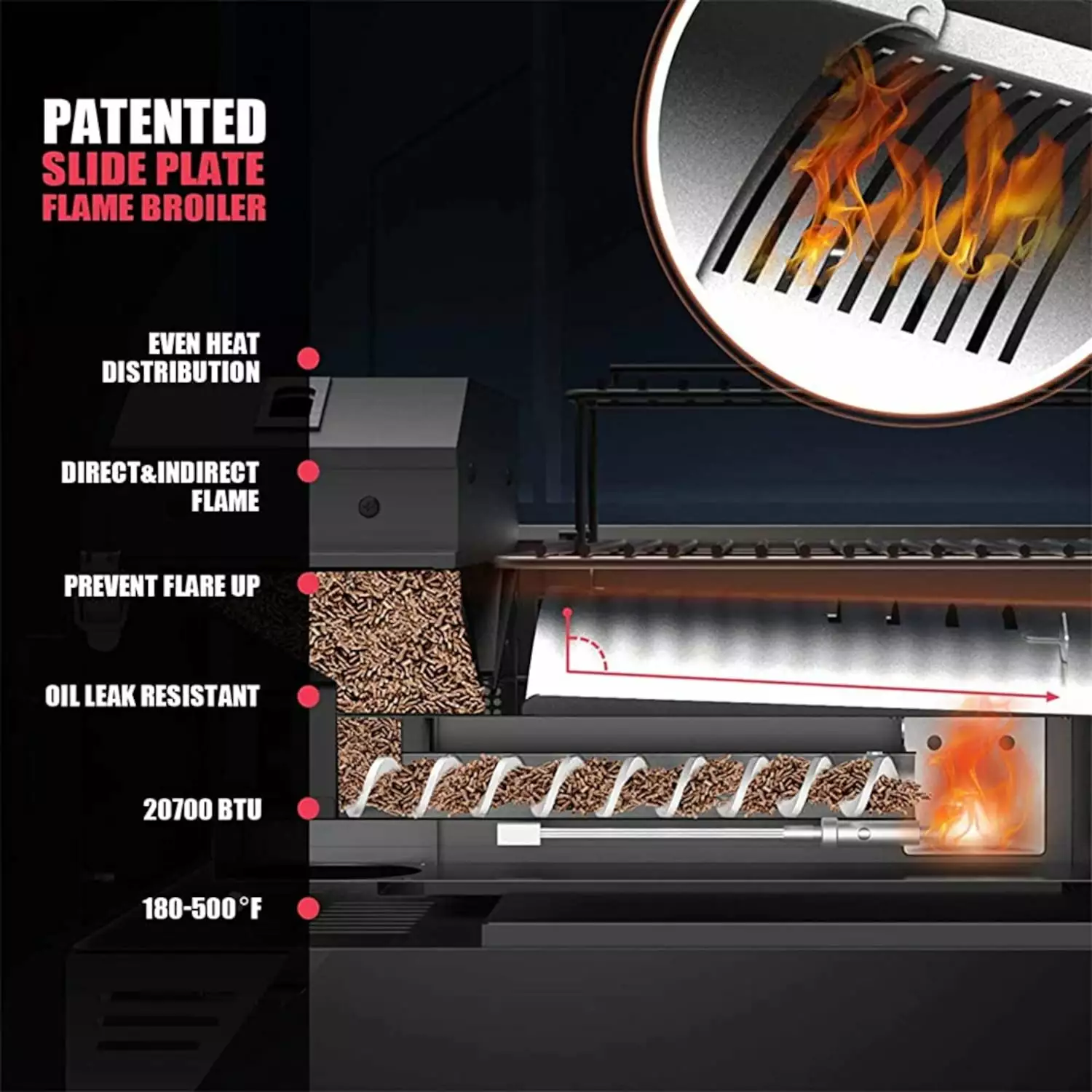- NO FLARE UPS: Proprietary internal design with patented stainless steel slide-plate flame broiler supports either direct or indirect heating. and ensures safety during grill and even heat distribution.