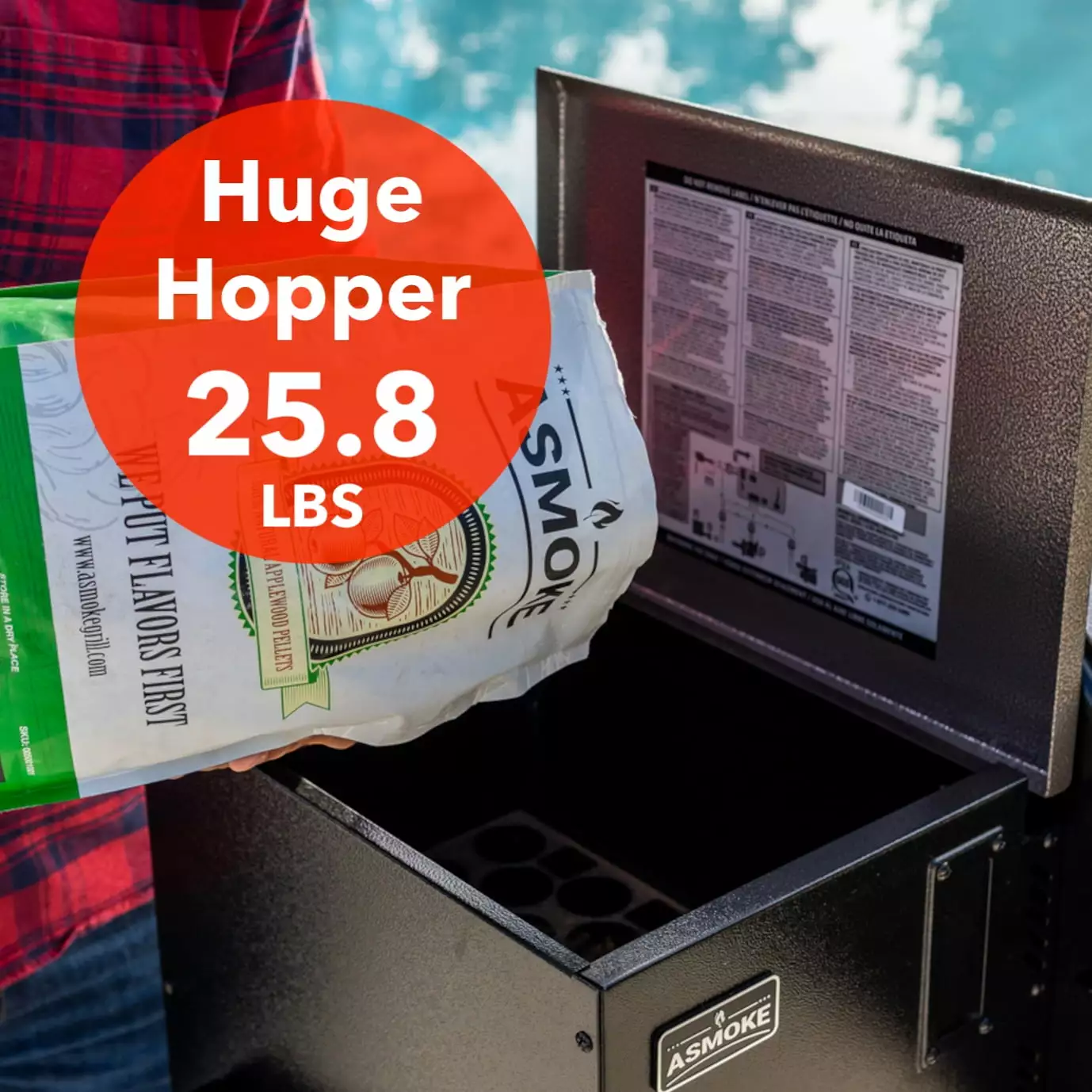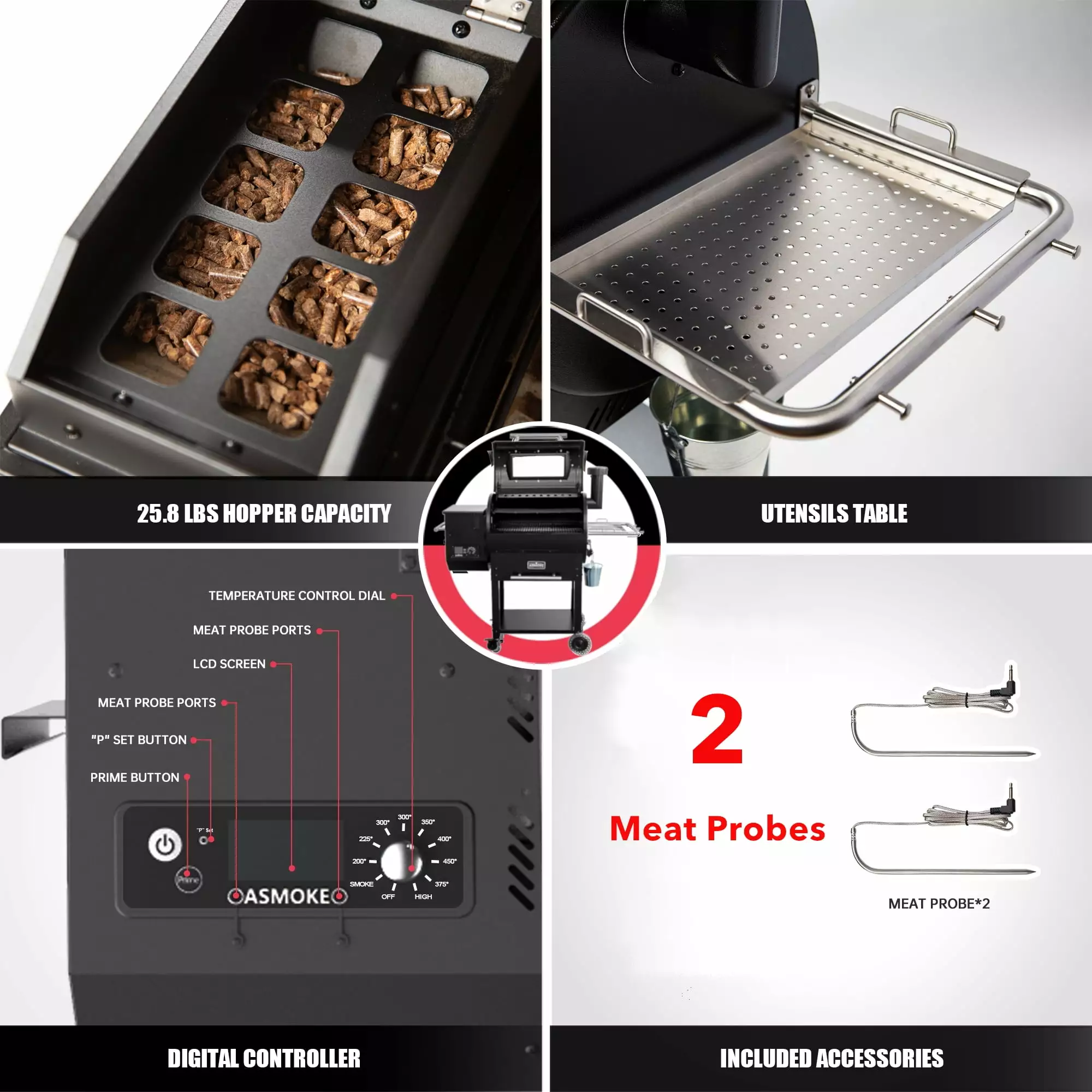 ASMOKE AS700P Pellet Grill can BBQ. bake. roast. braise. smoke. sear. broil. and char-Grill. Hot and fast or low and slow. and brings the added convenience of a View Window with Motion Lights. Just wave your hand to take a look. We recommend all-natural ASMOKE Applewood pellets to achieve a rich mouth-watering flavor Try it and you’ll taste the difference that there isn’t any easier way to get the flavor of wood smoked meals than with our Pellet Grill. 484 SQ.IN. main rack and 216 sq. in. top rack. totaling 700 sq. in. Ideal for A larger 3-12 member get-together. Featuring A whopping 25.8 lbs. hopper capacity makes it ideal for continuous smoking advanced auto pellet feed system and heating fans maintain temperatures from 180 degrees F to 500 degrees F. LCD controller keeps precision within 10 plus or minus degrees and display real-time temperatures proprietary internal design with patented stainless steel sliding flame broiler plate supports either direct or indirect heating. ensuring your safety during grilling. and consistent even heat distribution heavy-duty steel construction. certification. Porcelain-coated cast iron cooking grids with FDA and SGS certification. It is built to withstand all the elements and prevent rust.