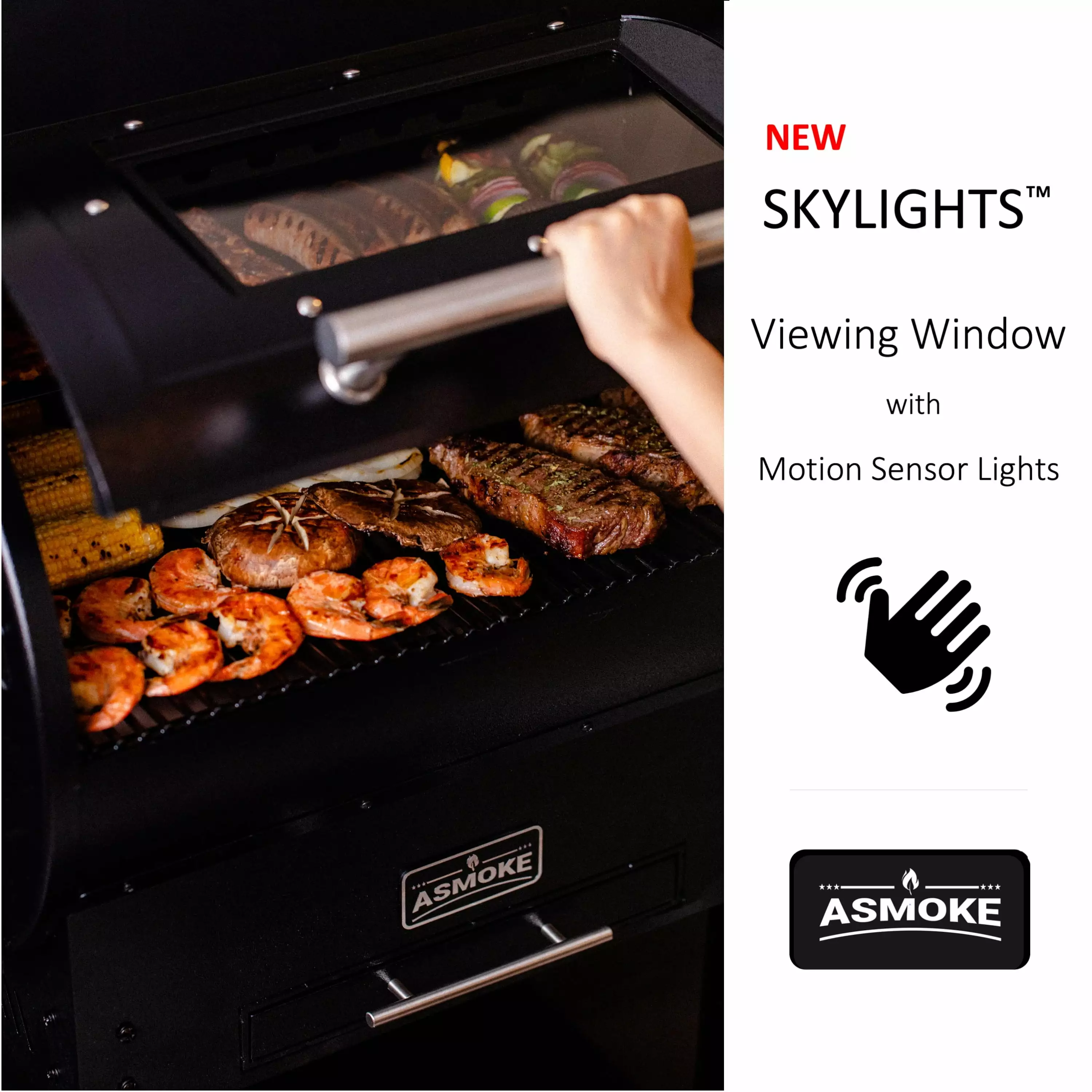 - SKYLIGHTS GRILL WINDOW DESIGN: New innovative see-through grill window system with a hand motion detection light makes the best grilling and smoking experience! You can check your foods anytime you want and don’t need to worry about smoke & steam loss or temperature drop due to the frequent grill lid opening.
