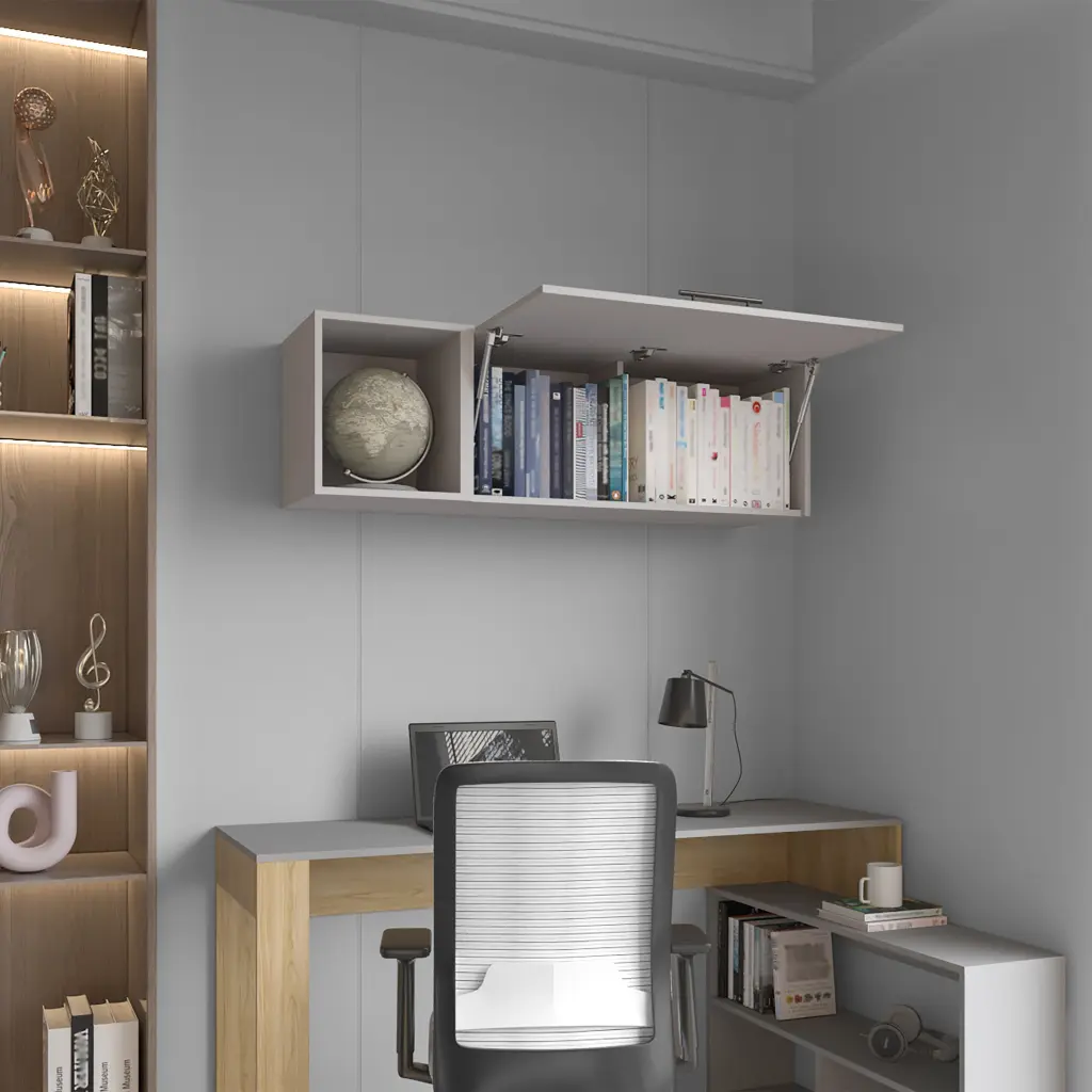 Featuring a gas spring mechanism for the cabinet door that allows in to open upwards and allowing easier access to stored items