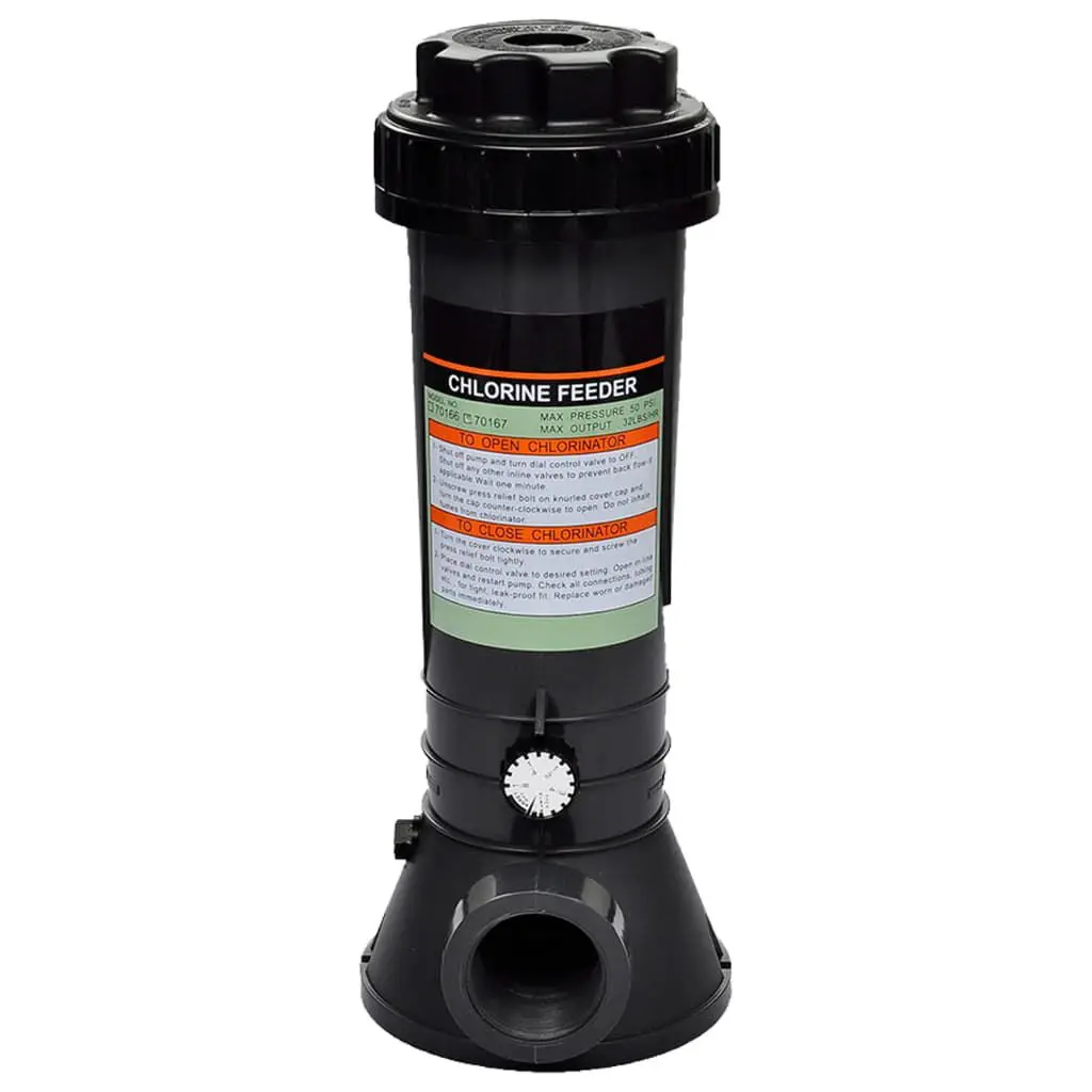 This automatic chlorine feeder is designed for installation next to your filter system. It is operated by the pressure differences of your system which draws water through the feeder.