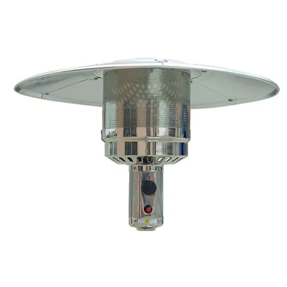 87″ Tall Stainless Steel/Black Outdoor Patio Heater. Chilly nights Call for an outdoor heater & what better way to solve this problem than with our patio heater. This patio heater will make a great addition to your patio, as it will allow you to enjoy the outdoors when the temperature starts to drop. This beautiful CSA authorized patio heater is readily assembled. 87″ tall patio heater with Hammered Rustic gold & stainless steel finish & adjustable table. Access door design. Variable temperature control, up to 48, 000 BTU’s. Wheels for easy mobility, thermocouple & anti-tilt safety devices. Burner cover & regulator included. Uses a 20 lb. propane tank (not included).