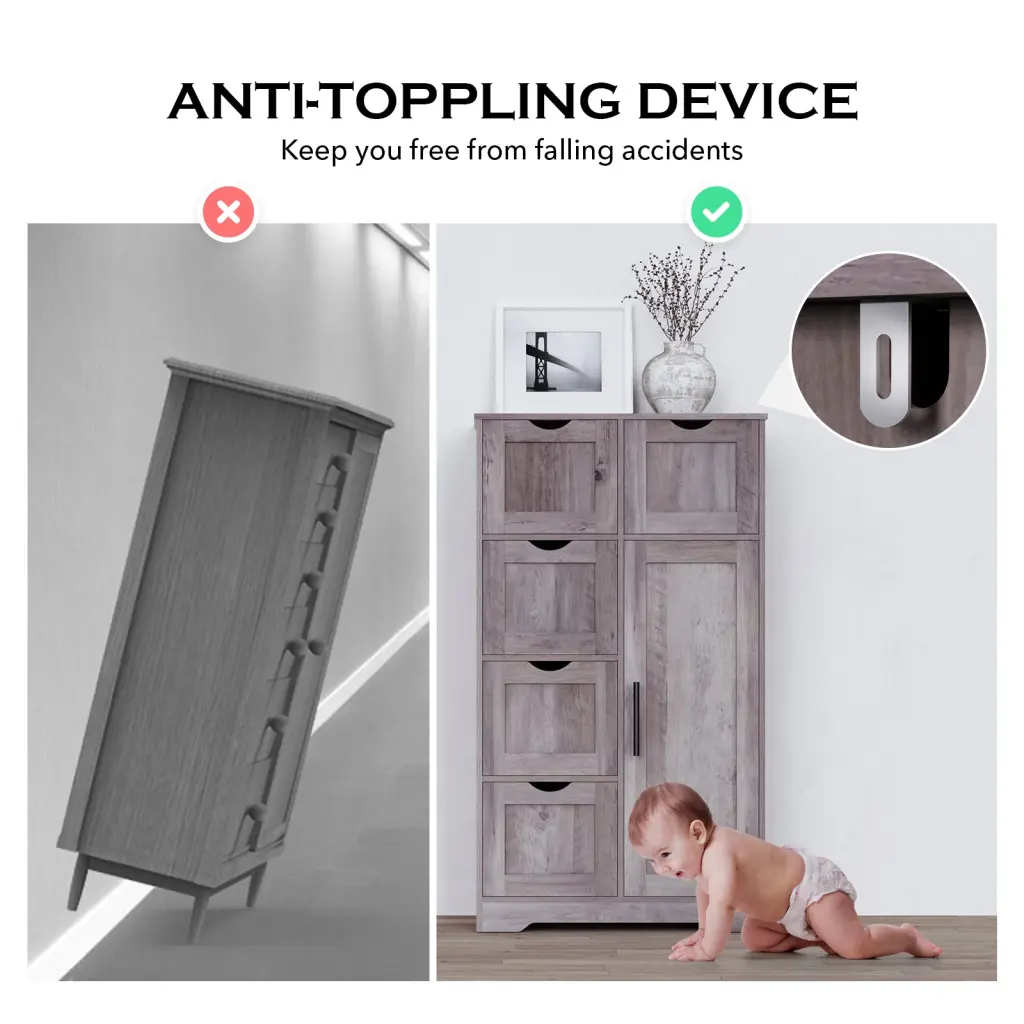 Bathroom Storage Cabinet with Storage 5 Drawers and 1 Door, Entryway Cabinet with Customizable Shelf, Accent Cabinet for Bathroom Kitchen Living Room and Office, Grey Description: ANTI-TOPPLING DEVICE ANTI-TOPPLING DEVICE ADJUSTABLE SHELF ADJUSTABLE SHELF EASY To ASSEMBLY EASY To ASSEMBLY Characteristics: Idea Spac