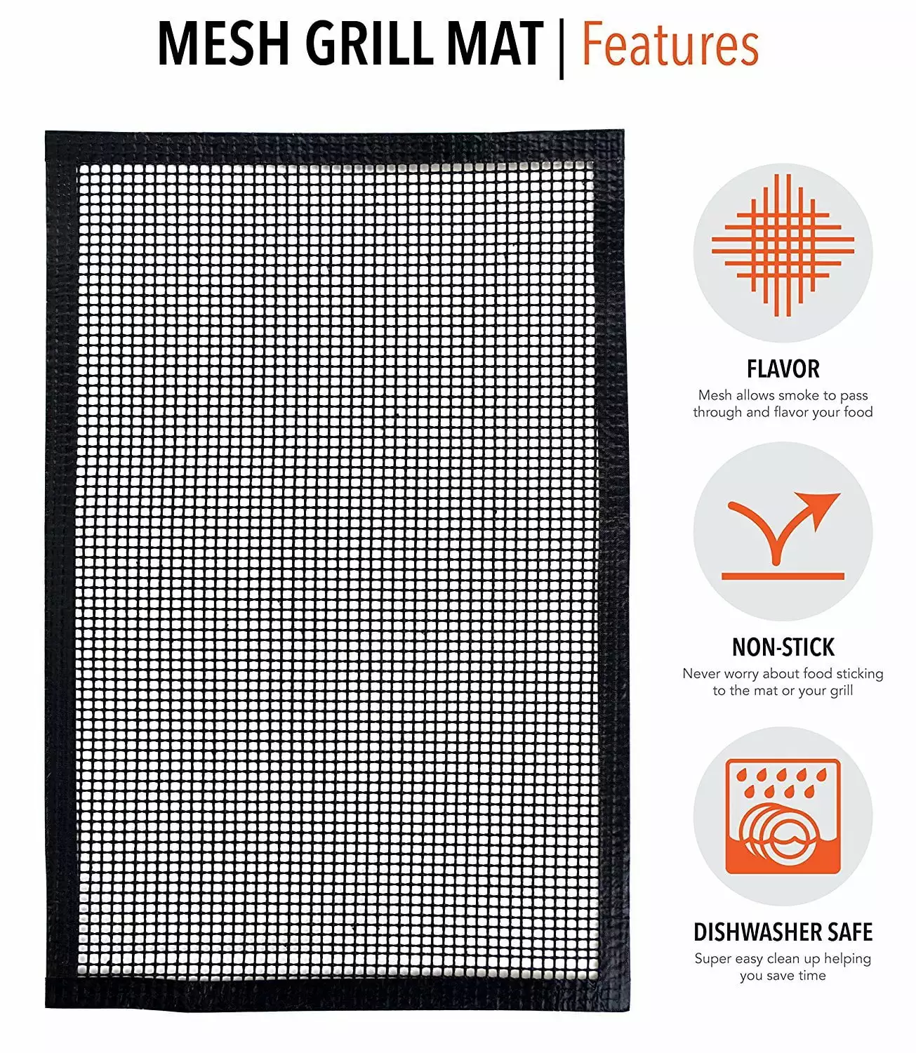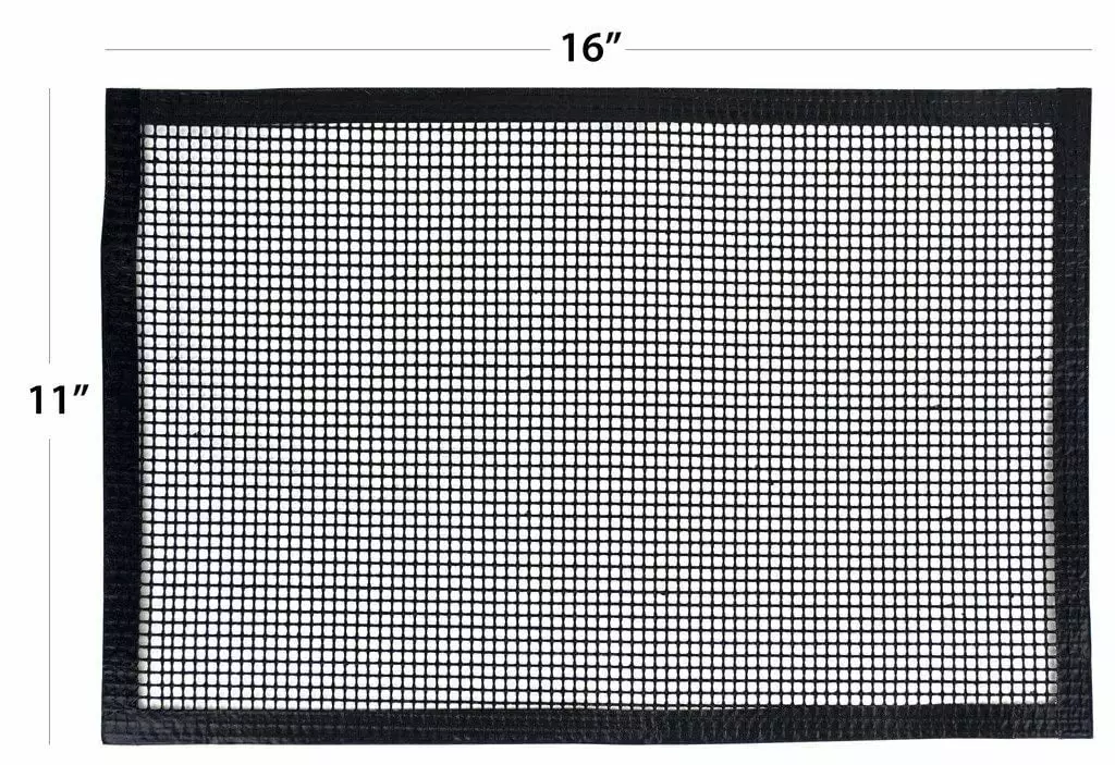 Get the most flavor out of your BBQ with this generous 11X16 INCH GRILL MAT while keeping a non-stick cooking surface! Enhance your collection of BBQ tools with the BBQ Butler mesh grill mat. Set your culinary skills on fire! This GRILL MAT ALLOWS MORE DELICIOUS SMOKE AND CHARCOAL FLAVOR TO PENETRATE YOUR FOOD. Imagine the enhanced smoke flavor to fish. vegetables. shrimp. bacon. wings. jerky. shish-kebabs. pizza and more using your smoker. The sky is the limit. Grill sheets (also called grill toppers) serve as a GREAT REUSABLE ALTERNATIVE TO FOIL AND PAPER. Our Mesh Grill mat can also be used with ovens and grills. DO NOT USE THIS PRODUCT IN DIRECT CONTACT WITH FLAMES. NOT FOR USE WITH GAS GRILLS. FOOD GLIDES RIGHT OFF AND KEEPS YOUR ITEMS FROM STICKING TO THE GRILL GRATE. Saves time scraping the grill so clean up is a snap. Easily washed in the top rack of the dishwasher or clean by hand. Before you know it. your mesh grill mat is fresh and ready to go: ready to use over and over again. The next level of grilling is yours for the taking with this most versatile of grill mats!