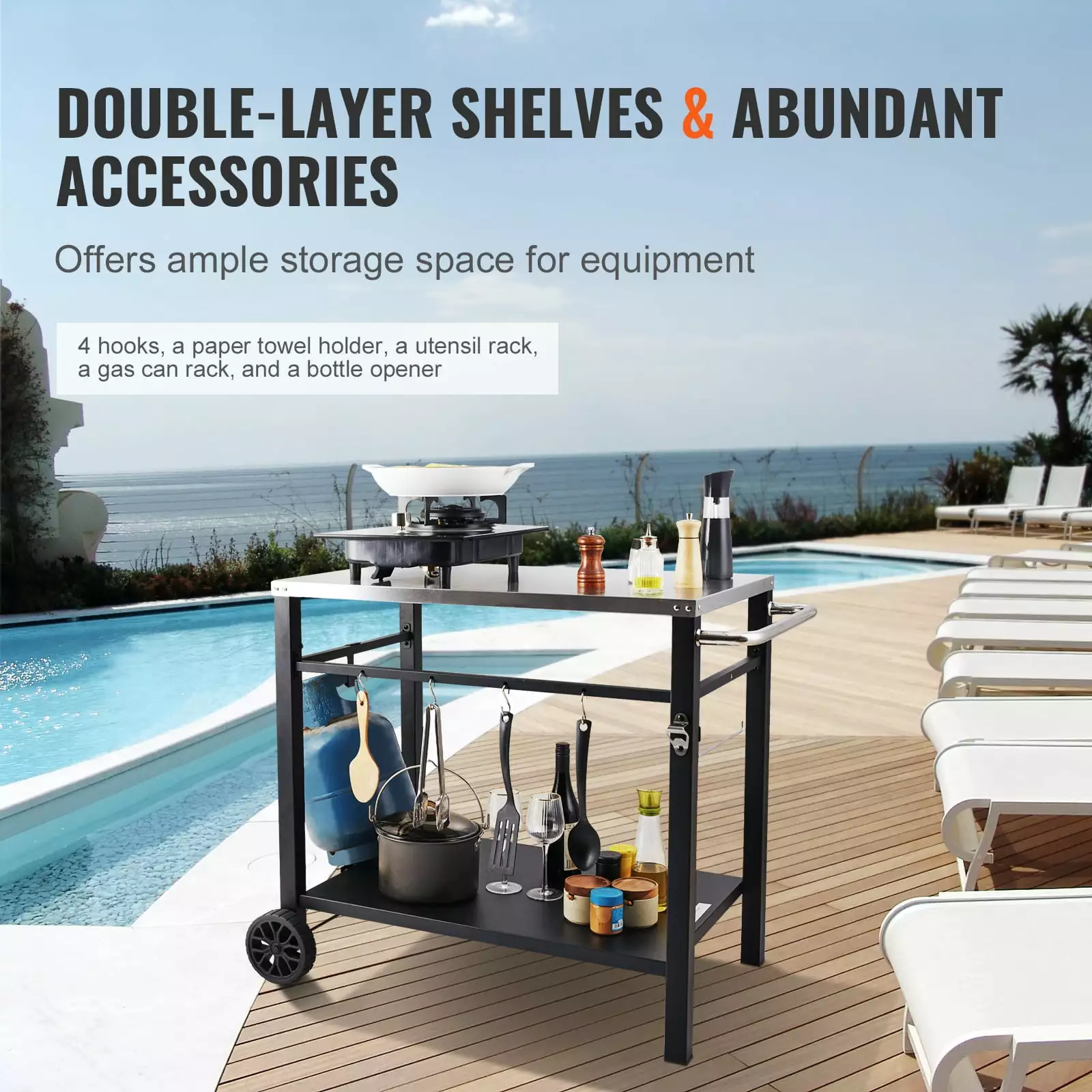 Double-Shelf Outdoor Grill Dining Cart It can be used as a barbecue table or pizza oven stand. it can also be used for food preparation. storage. outdoor dining. and more. It provides a convenient and practical workstation for outdoor cooking. Versatile Usage Scenarios This outdoor grill dining cart not only serves as a grill or pizza oven stand but also functions as a storage unit and food preparation workstation. Whether it’s a party. camping. or a picnic. this table caters to your diverse needs. High-Quality Stainless Steel The table top is made of high-quality stainless steel. ensuring durability. rust resistance. waterproofing. and easy cleaning. For your safety. we have carefully polished the edges of the tabletop to avoid any potential hand injuries from sharp edges. Practical Design with Multiple Accessories Designed with a double-tiered shelf. outdoor prep cart can store large kitchen equipment such as ovens. firewood. and barbecue racks. You can also hang various small kitchen utensils and tools on the four hooks. making your kitchen more organized. Moreover. we have prepared a paper towel holder. knife rack. gas canister holder. and bottle opener for your convenience during use. Better Load Capacity Our wheels are crafted using high-quality injection molding technology. offering superior load-bearing capacity compared to the blow-molded wheels commonly used in similar products on the market. User-Friendly Assembly Design The package includes clear installation instructions and a parts list. making assembly a breeze without the need for additional tools or manpower. It saves you from dealing with tedious installation procedures. allowing you to enjoy a stress-free experience. Thoughtful and Practical Features The double-shelf outdoor prep cart is equipped with two directional wheels for enhanced portability and flexibility. Additionally. the stainless steel side handle design makes it convenient to move the cart and hang essential tools.