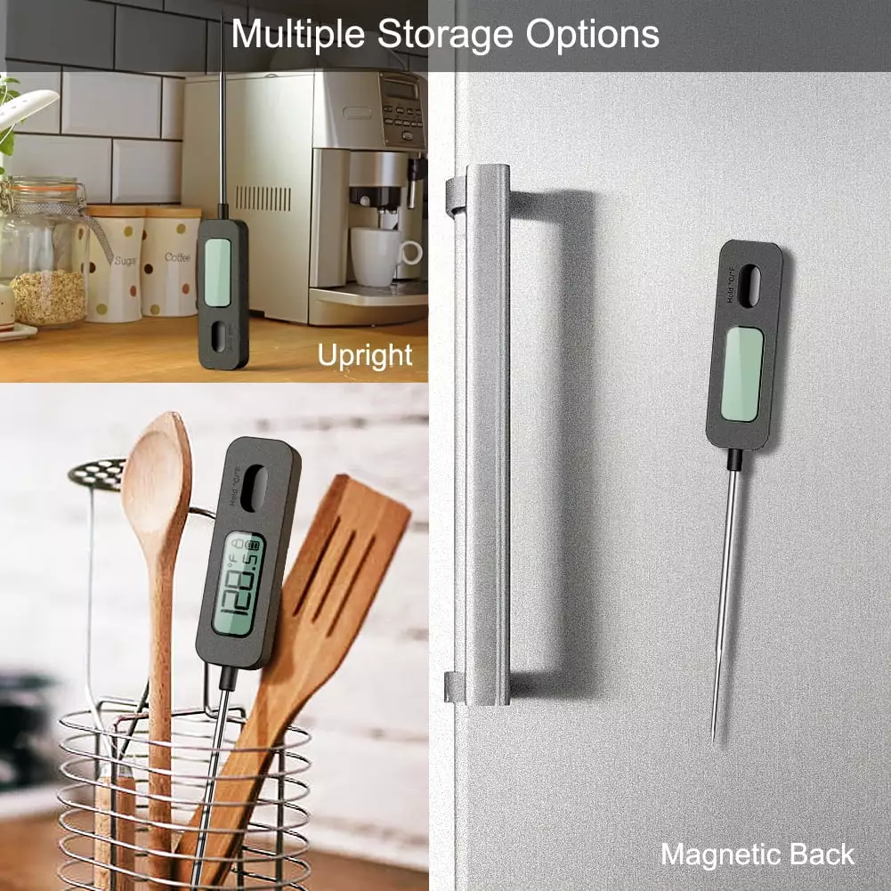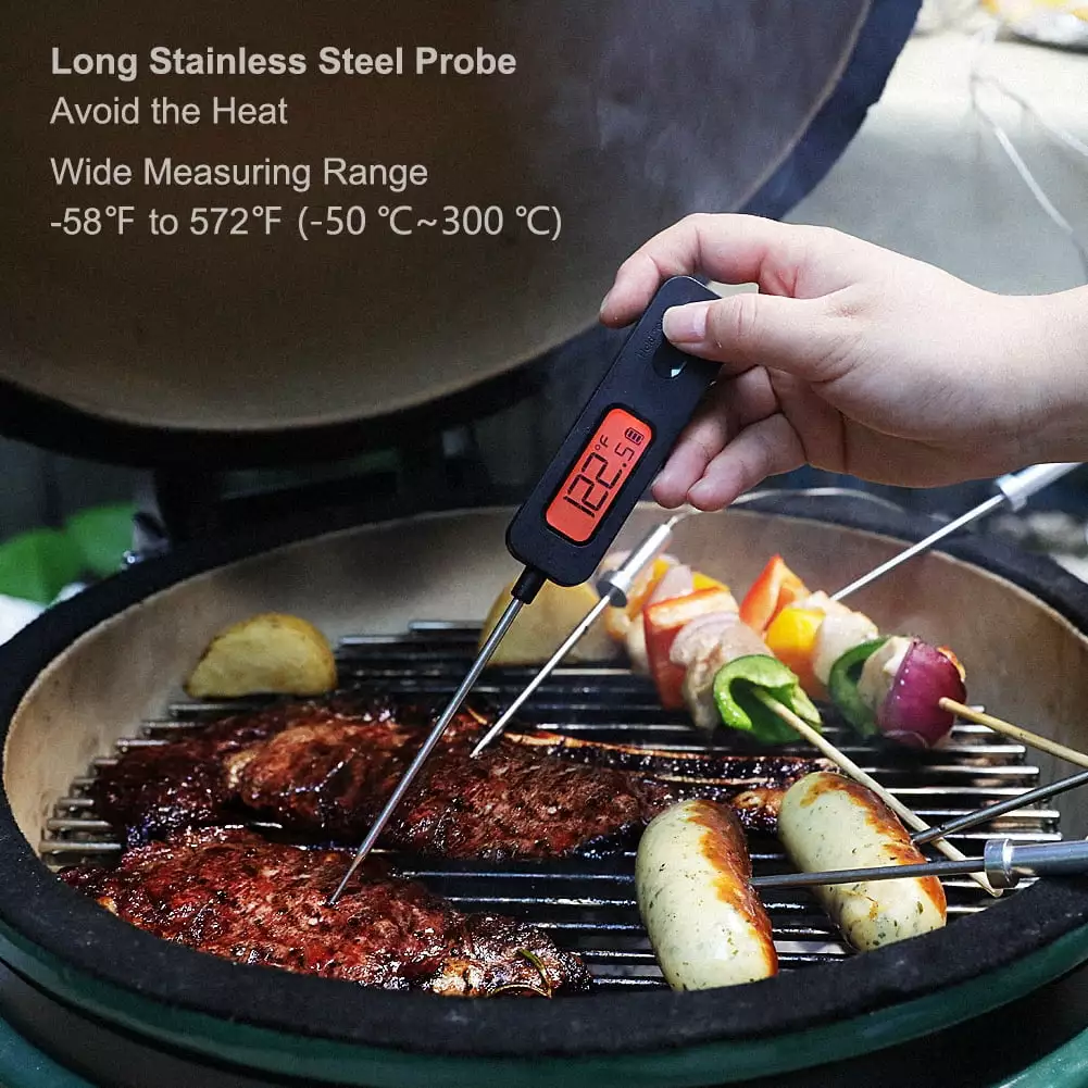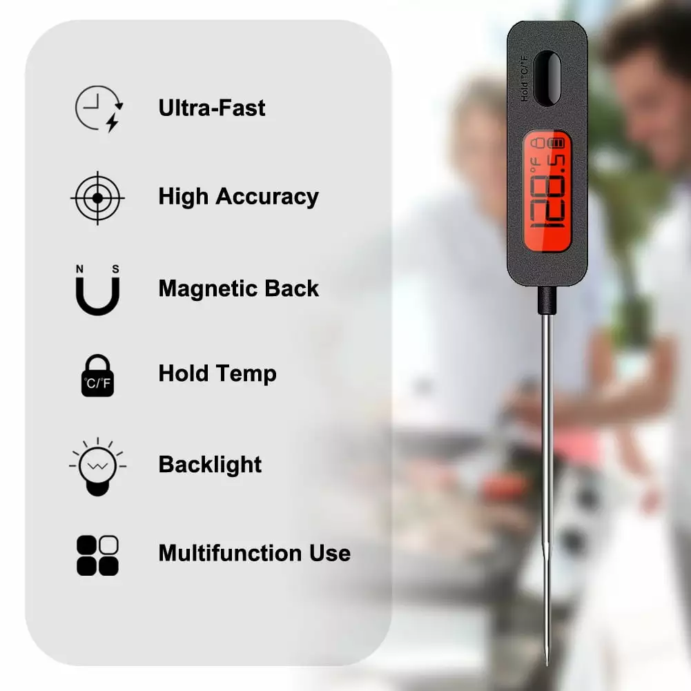 - Clear display and backlight screen: The high-definition large LCD screen with patented fonts. no ghosting. high-precision digital sensor. every viewing angle is highly sensitive. and the orange backlight allows you to read numbers easily in the dark whatever day or night. The food makers will fall in love with this meat thermometer.
