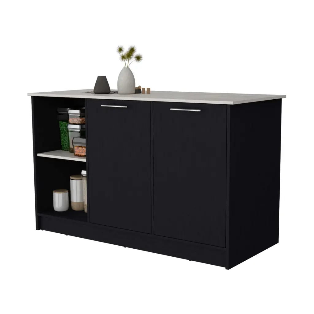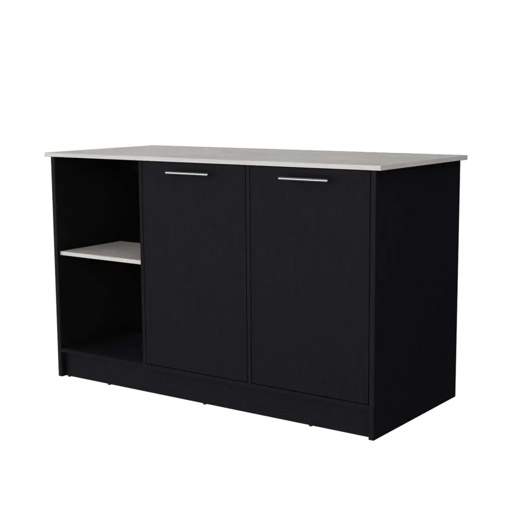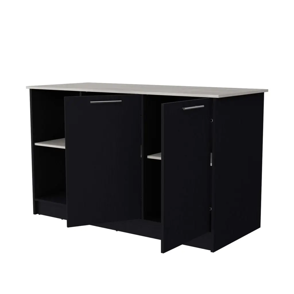 Black and Onyx Double Door Cabinets Kitchen Island Specification: Romance Copy Elevate your culinary experience with the kitchen island, offering a spacious countertop ideal for meal prep or stylish dining. Designed with two open storage shelves and dual double-door cabinets featuring inner shelving, ensuring all e