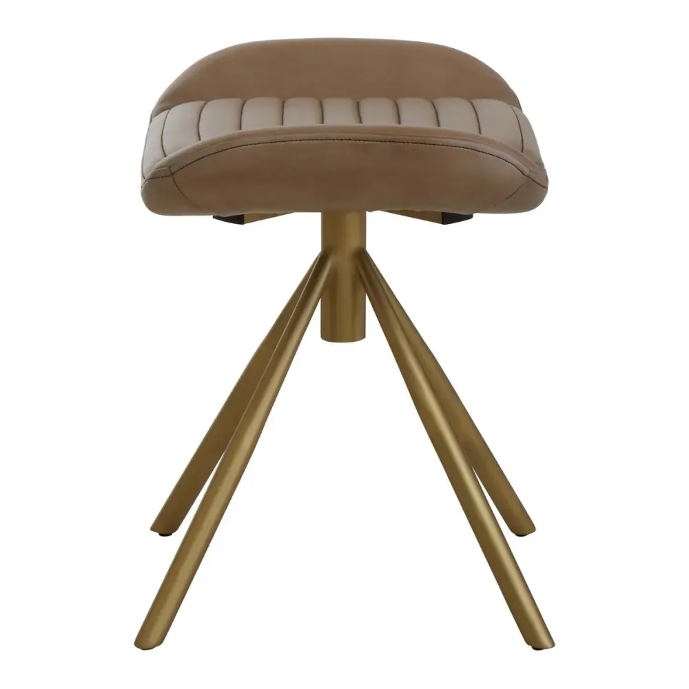 This footstool has a genuine grey leather padded seat with channel detailing and elevated slanted sides. The seat is complemented and supported by a luxe amber finish iron spoke base.