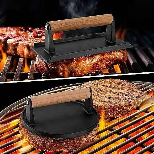 Prepare to be amazed as our grill press leaves behind mesmerizing grill marks on your steaks. giving them that irresistible. restaurant-quality appearance. The unique design of the press distributes weight evenly. allowing for consistent heat distribution and perfectly cooked meats every time.