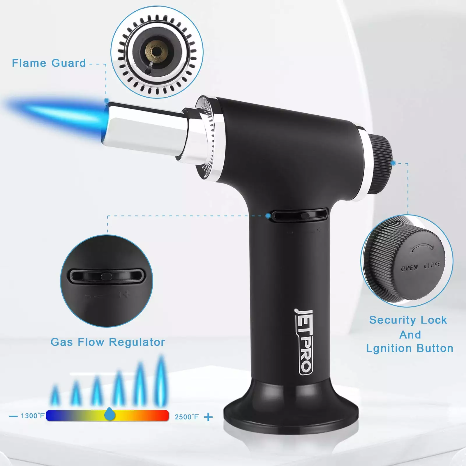 Adjustable Continuous Flame – Adjust the temperature range through the Adjust button. The maximum temperature can reach up to 2500 F to meet various needs. such as BBQ. caramel pudding. baking. soldering DIY jewelry and etc.