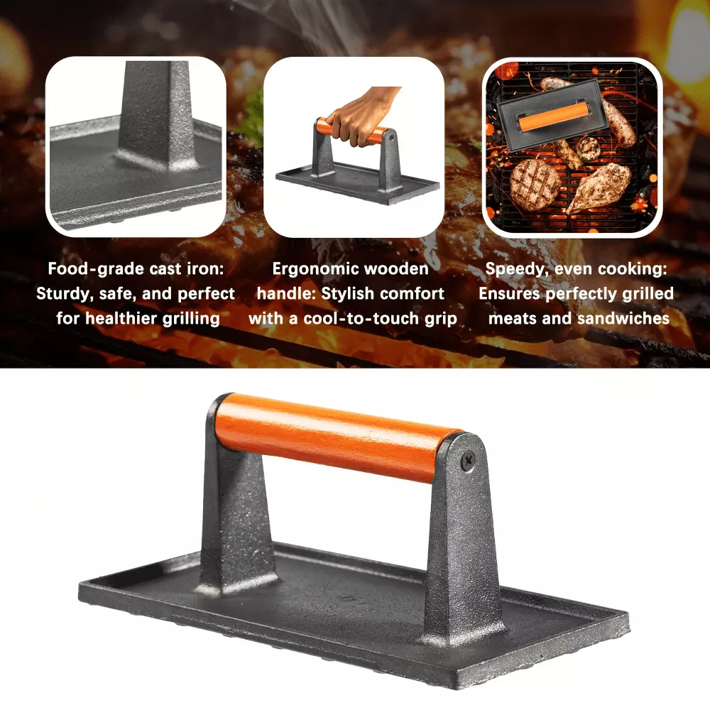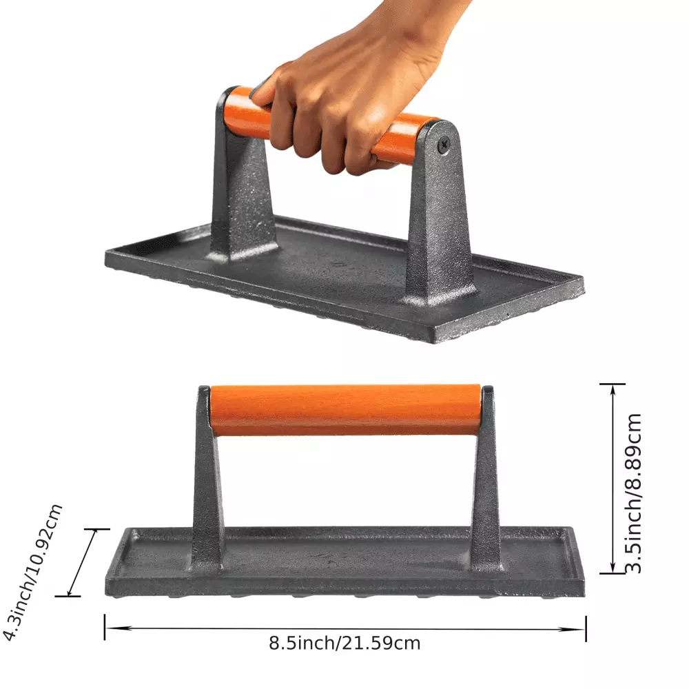 This bacon press is a practical kitchen tool. suitable for pressing bacon. hamburger meat. chicken and other ingredients. so that they are evenly heated and the cooking effect is enhanced. Made of cast iron with wooden handles. it has a sturdy and durable structure and is easy to clean. It is a must-have in the kitchen.