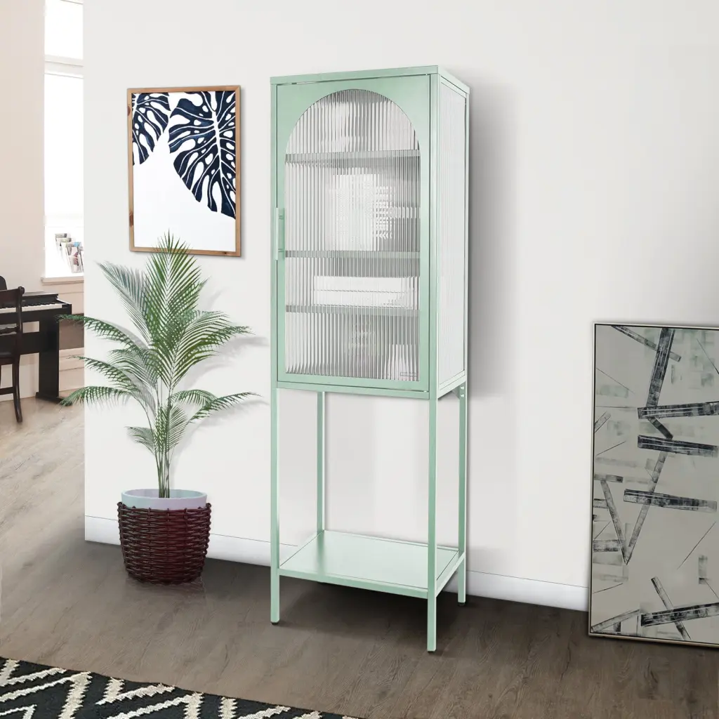 Chic Tempered Crystal High Cabinet with Arched Door Customizable Shelves and Feet Anti-Tip Dust-free Fluted Crystal Kitchen Credenza Light Green Specification: ADJUSTABLE SHELVES ADJUSTABLE SHELVES SIZE SIZE ADJUSTABLE FEET ADJUSTABLE FEET Descriptions Item Sideboard Fabric: Alloy metal/ Ferrous metal (Shelves) / Tempered