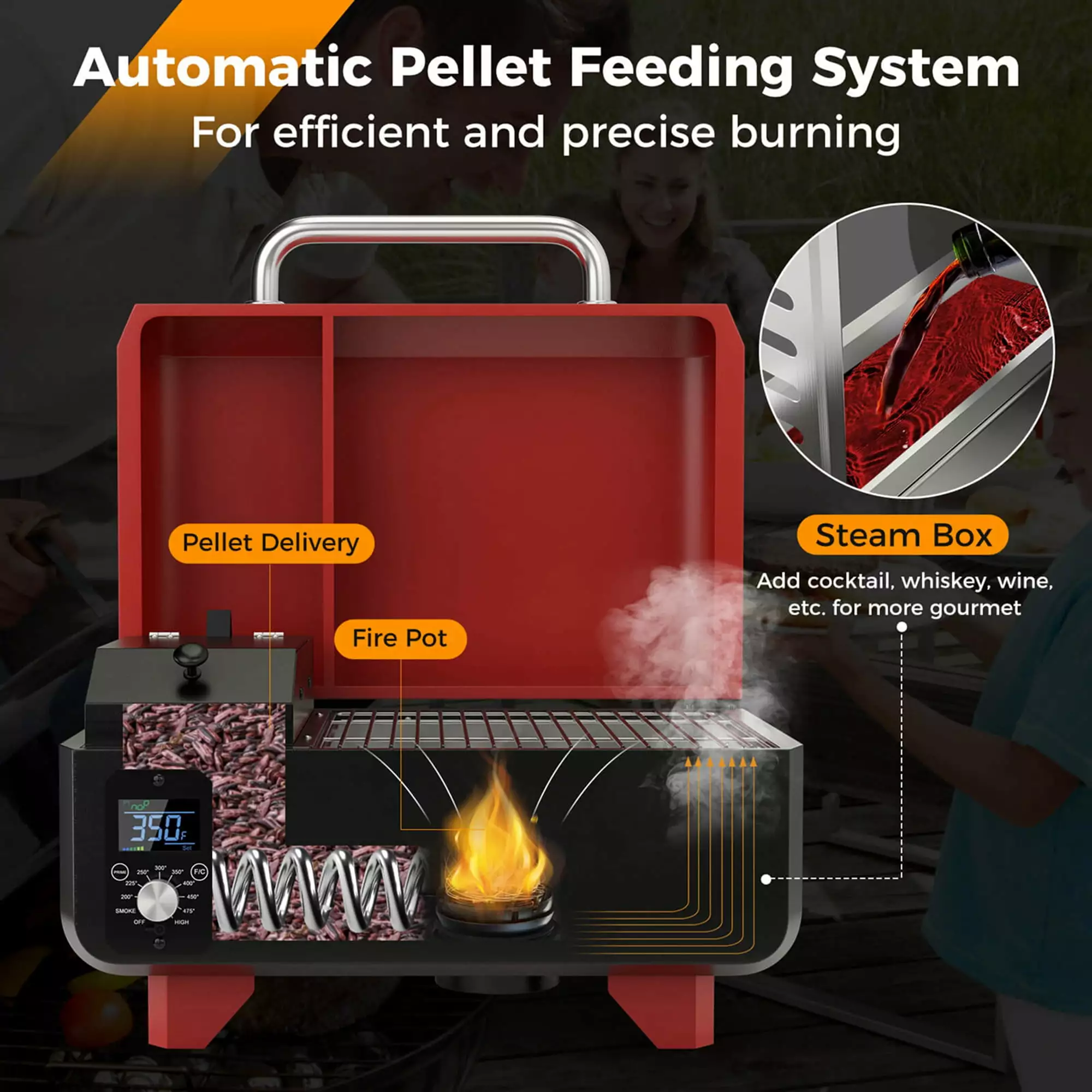 - User-Friendly Design: The 2.4 L hopper accommodates more pellet for long-lasting burning. And the non-stick cooking grid provides 184 inch2 cooking area. Moreover. the steam box on the grease tray allows you to add cocktail. whiskey. wine. etc. for more gourmet.