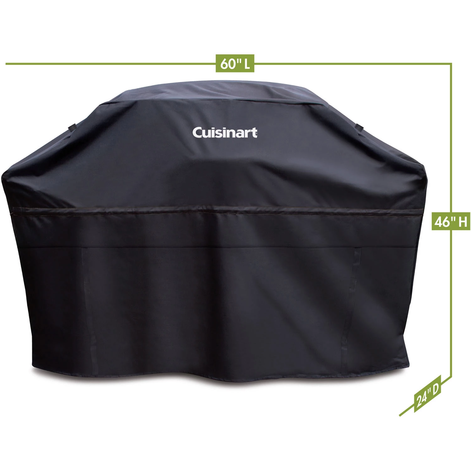 Season after season. the Cuisinart 60-inch heavy-duty grill cover is built to last. This cover is the perfect combination of durability and convenience. With wind and water resistant fabric. your grill will stand the test of time and be safe from the elements and UV rays. The dual-sided vents will dissipate excess heat to prevent condensation and the dual-sided grip handles allow for easy removal of the cover. With snapping lock wheel fasteners and adjustable draw strings. you will never have to worry about the wind blowing your cover off your grill. If that isn’t enough. the easy-access flap built into the cover allows for quick access to your tank so you can make adjustments without fully removing the cover.