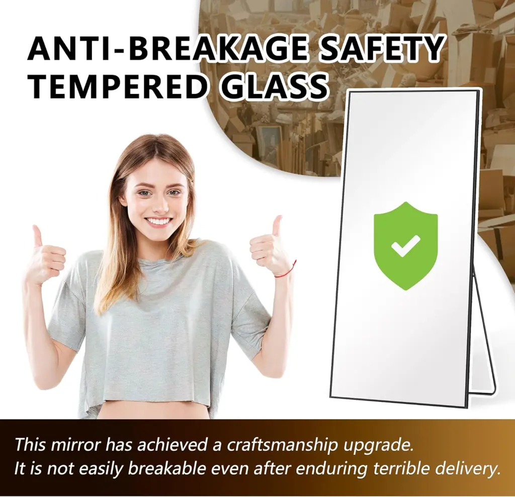 High Definition ReflectionMade with high-definition glass, tempered for strength, and featuring a shatter-proof film, this floor mirror provides crystal-clear reflection while significantly reducing the risk of breakage.