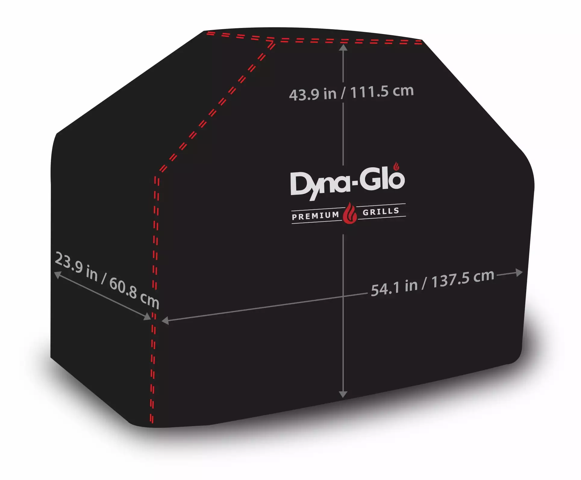 Provide year-round protection for your grill. with this Dyna-Glo Premium BBQ Cover. Made with water resistant. heavy-duty PVC shell and 900 Denier polyester lining to withstand harsh elements. Double-stitched seams provide additional strength and durability to help prolong the life of the cover. This cover also features durable nylon & rubber side handles for easily removing or handling the cover before and after use; Hook and loop fastener adjustment straps for a customized fit and mesh side vents that provide much needed airflow for keeping the grill moisture free. Cover dimensions: 54.1" W x 23.9" D x 43.9" H (137.5 x 60.8 x 111.5cm). Fits all Dyna-Glo 5 burner gas grills. or standard gas grill with assembled dimensions of 57" W x 25"D x 47"H (144.7 x 63.5 x 119cm)