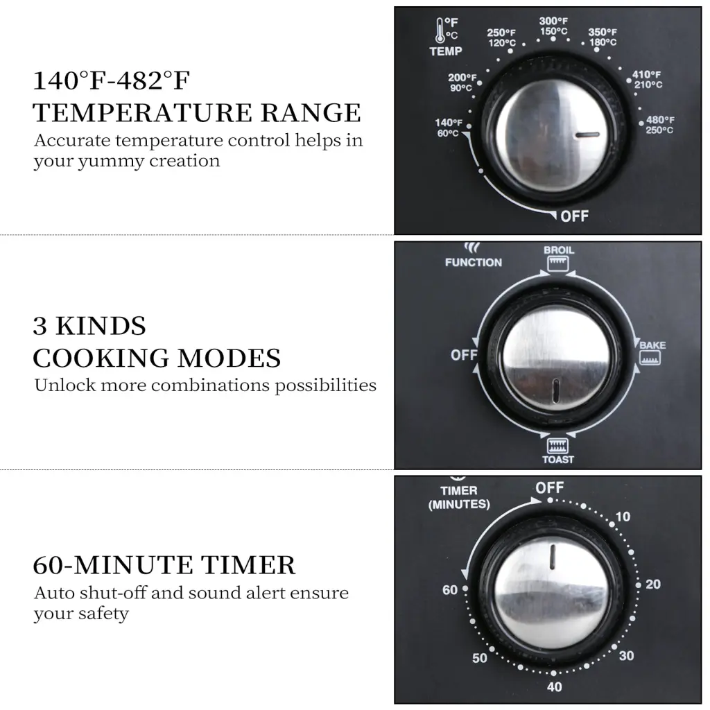 3 Functions in 1 : This toaster oven is perfect for bake, broil, ,a toast, and all viewable through an adorable functional window/door.It is also great for reheating, small pizzas, cauliflower wings etc