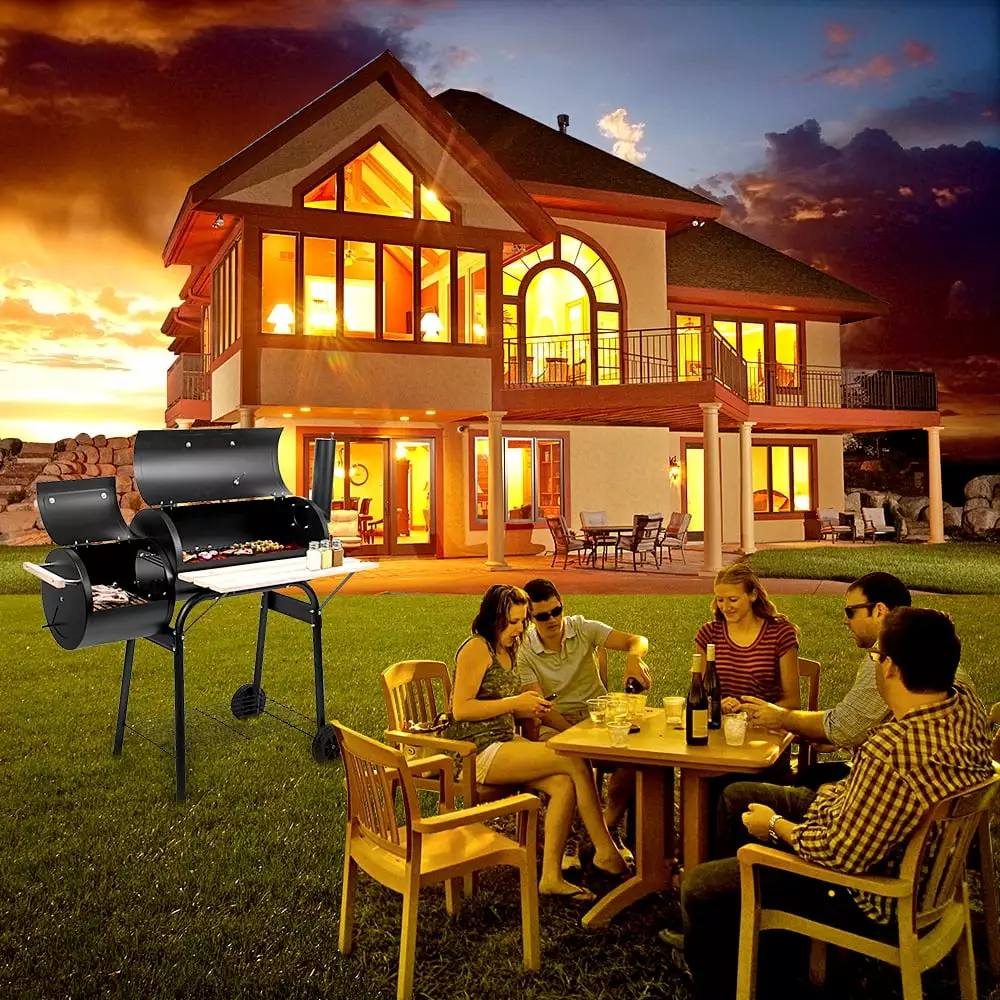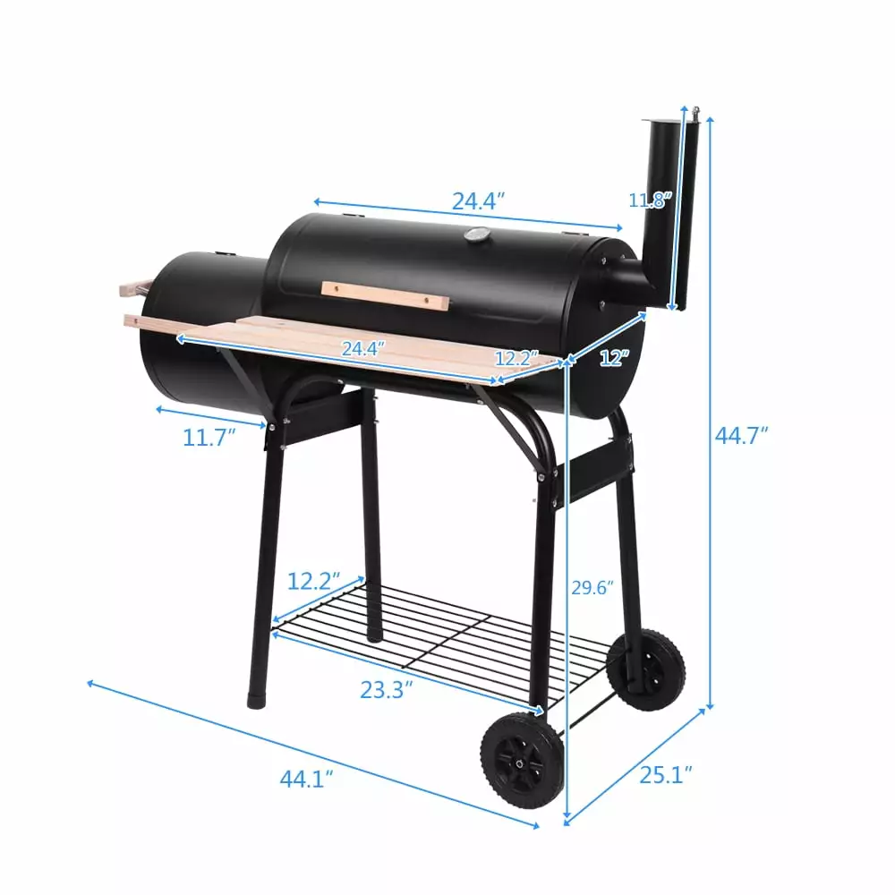 The Charcoal BBQ Grill and Offset Smoker Combo is a great choice for the beginner griller or for someone looking for a more compact sized option. This charcoal grill has two separate openings: one for the grill itself. and the other for the connected offset smoker. allowing for the ultimate backyard experience. An easy-to-read thermometer is connected on the main lid so you never have to worry about opening the lid to check the temperature. The wooden shelf and a metal grating provide maximum space for storage. Lightweight. easy-to-move. this bbq grill is a perfect addition for anyone who looks forward to cooking outdoors. If you are looking for a multifunctional BBQ grill. this one is your best choice! Bring it to your home and enjoy the happiness offered by it!