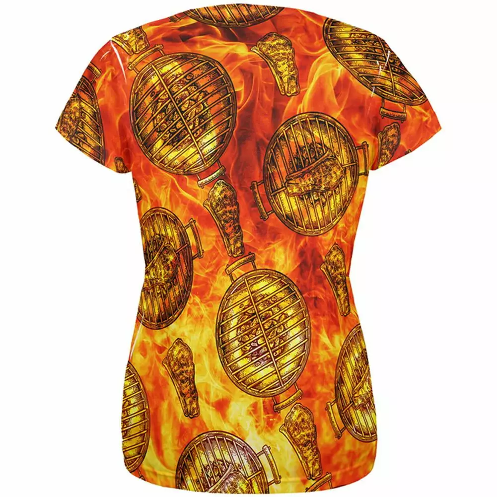 Get in grilling spirit with this awesome shirt. This Old Glory design is printed on a polyester womens t-shirt. featuring an all over steak and charcoal grill pattern over a fire background. The dye sublimation printing process creates slight imperfections that are unique to each item.Officially Licensed Merchandise