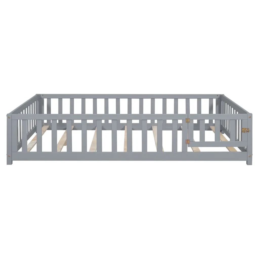 Full Dimensions Floor Platform Bed with Fence and Door for Kids, Montessori Floor Bed Frame with Assistance Slats for Toddlers, Timberen Floor Bed Grey Specification: Feature: The floor to ceiling bed with fence and door is carefully designed for our young children. The surrounding fence will provide perfect protection for th
