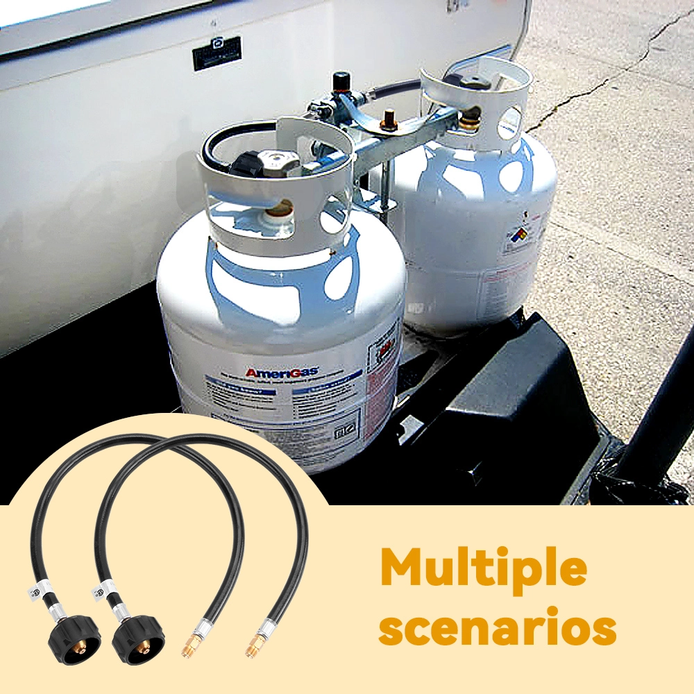 The GASSAF propane hose can be connected to the RV Auto two-stage regulator or can be used to connect to the installed 4-port tee as an auxiliary propane supply