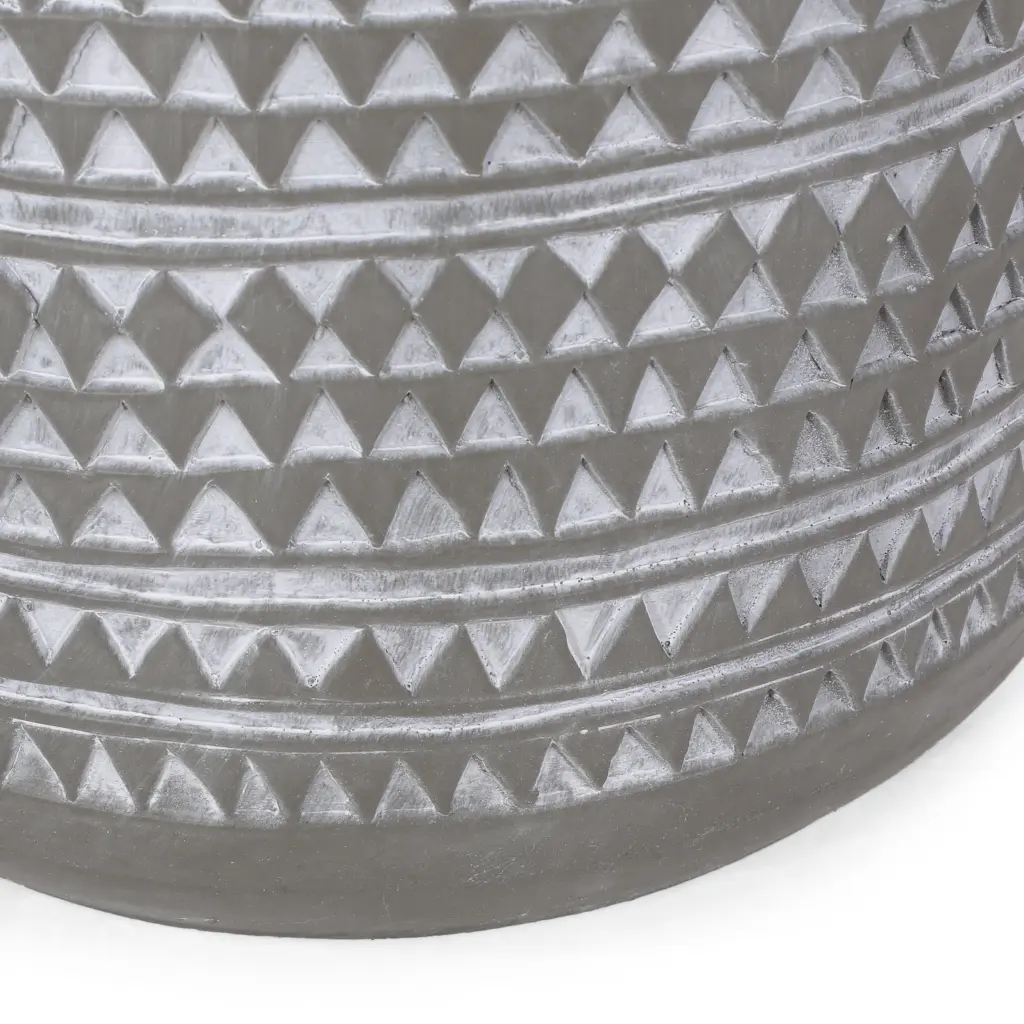 Set up your outdoor space for success so you can lounge in style. With a smooth lightweight concrete structure and modern touch. our side table offers high durability and stunning looks for your backyard or patio. Ideal as a decorative piece or as an end table next to your chat set or sectional. this piece will hold any snacks or chilled drinks in sophisticated grace. Finished with a cylindrical structure and an intricate triangular pattern. this table is a seamless addition to any space.