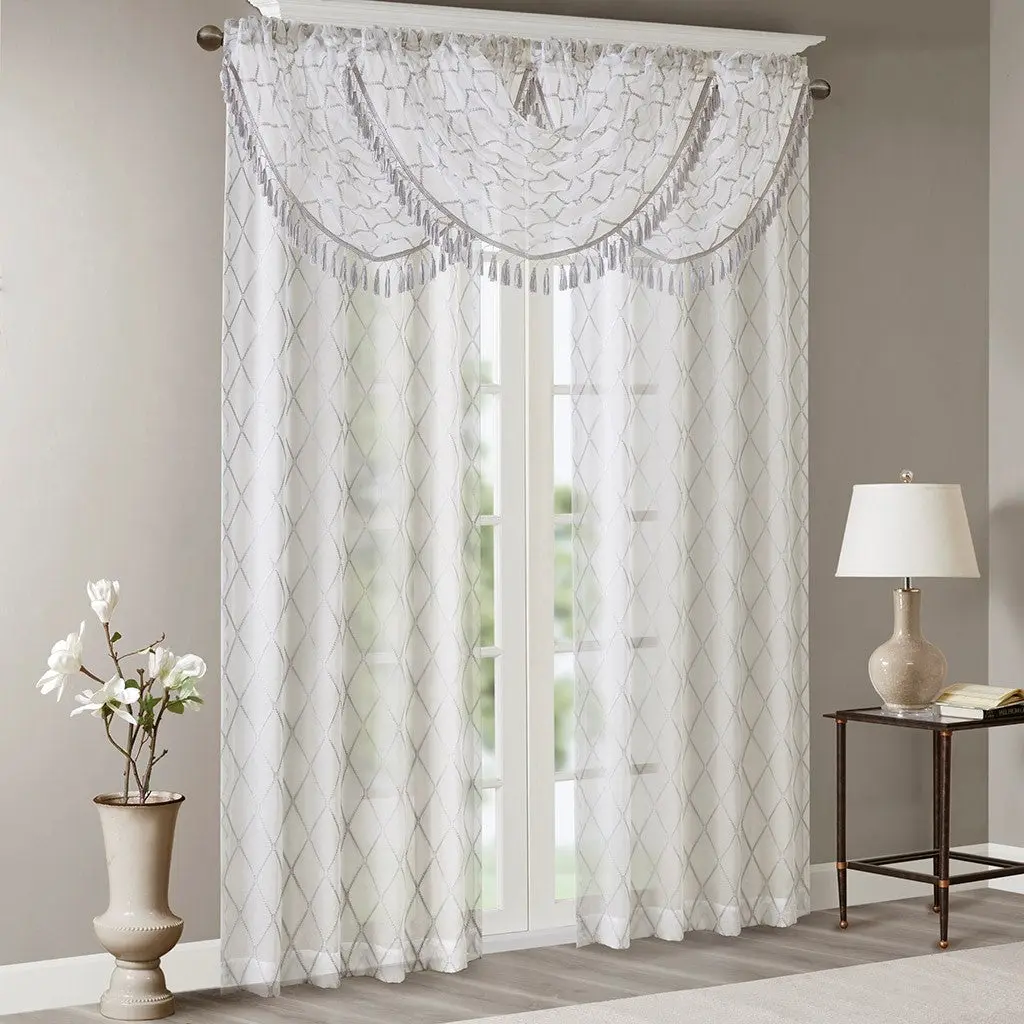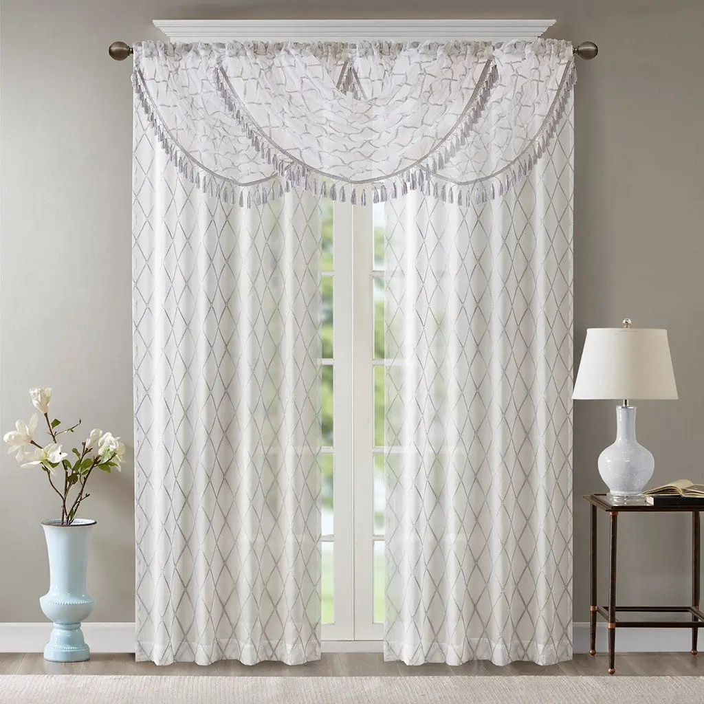 Gemstone Sheer Embroidered Waterfall Valance White/Grey 38×46″ Specification: Specification Madison Parks Irina Gemstone Sheer Waterfall Valance provides an alluring update to your home. An elegant diamond pattern is beautifully embroidered on a soft sheer fabric, adding grace and charm to your dcor. The neutral colors