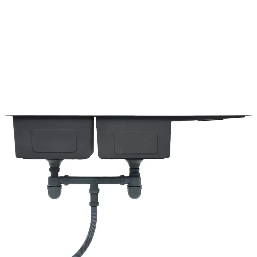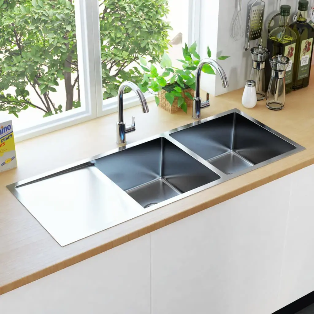 Combing the best in function and design, this double bowl sink is crafted of high-graded handmade stainless steel in anti-condensation paint, lead free. It is sound proofing with the sound-reduction pads. The drainboard will come in very handy not only when washing dishes by hand but also as an extra place for cutting vegetables. Additionally, the bowls with a unique X-flume design facilitate quick flow, preventing standing water in the bottom of the basin.