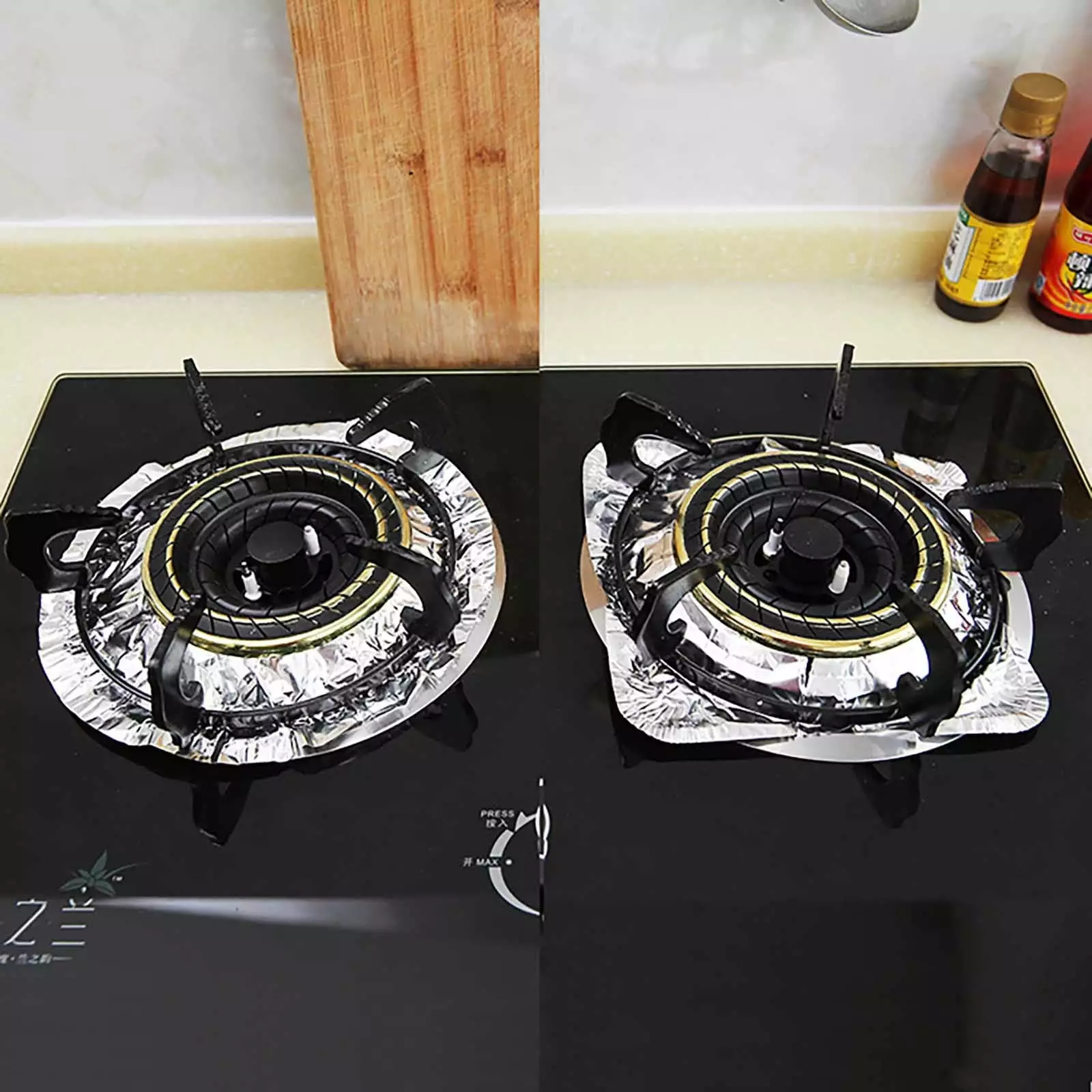 Universal Size]Pack of 10. standard size (8.5 x 8.5 square). open hole (diameter. 3.7) aluminum foil bibs fit most gas stoves. If needed. you can use scissors to cut the opening larger.