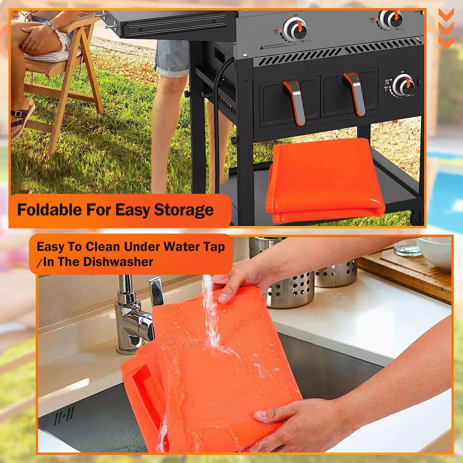 Ready for BBQ party anytime with this food grade silicon griddle mat! It offers full protection to your griddle from unwanted elements like pollen. leaves. and animal droppings. which can effectively shield your griddle from dirt and rust. keeping it stay clean and last longer. It’s also easy to clean with soap and water or just throw it into dishwasher machine for quick cleaning.