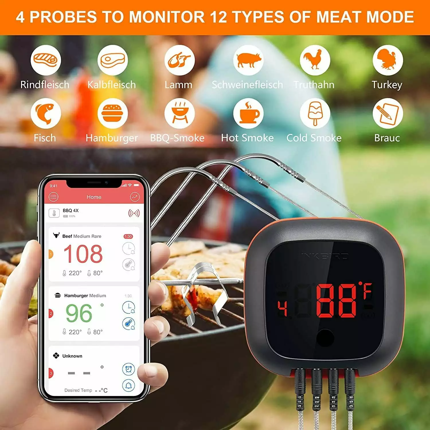 [Let You Free When Grilling] This Inkbird 4 probes grill thermometer can pair with Android or iPhone (Please make sure the GPS location is open). This bbq thermometer read your cooking temperature by your phone anywhere (Connecting distance range up to 150ft/50M). High temperature accuracy could let you be rest for your cooking. No need worry about your meal overdone with this Wireless Grill Thermometer. Please note: Tearing off the plastic protect film on the screen before using.