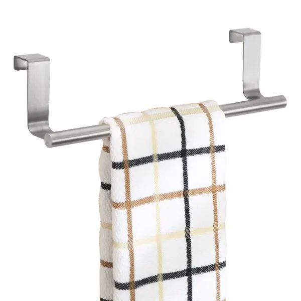 The InterDesign® Forma® Over The Cabinet Towel Bar is an innovative storage solution, no hardware required, can be hung inside or outside of cabinet, non-absorbent foam backing protects cabinets. The bar’s over-the-door construction allows it to be hung on either side of your cabinet or closet door for ultimate versatility, while its slender hooks won’t impede the door’s movement. Non-absorbent foam backing protects doors from wear, keeping surfaces in pristine condition.