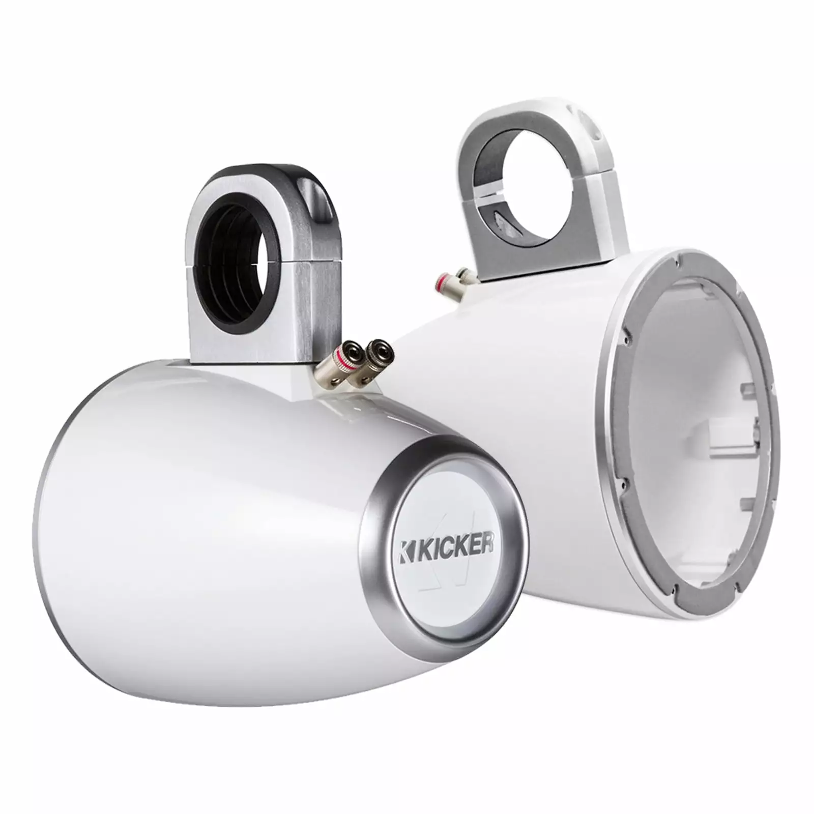 - SPEAKER ENCLOSURE: These Kicker marine tower speaker enclosures are designed specifically for marine and powersports applications. With rugged ABS plastic shells and an acoustic polyfill lining. you get long-lasting durability and outstanding performance. The package includes 2-5/8 inch aluminum tower-pipe clamps and mounting adapters.